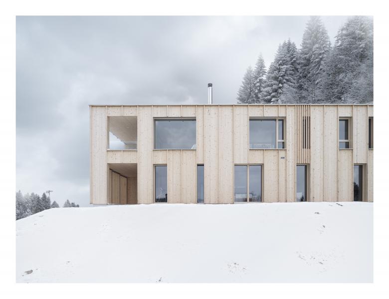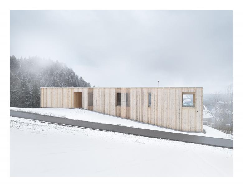Die Bergparzelle unweit von Bregenz am Südhang des Pfänderstocks bietet einen weitläufigen Blick von den Schweizer Bergen über die Landschaft des Bregenzerwaldes bis hin zum bayrischen Westallgäu. Als ruhiger, markanter Baukörper ergänzt das Haus die Siedlungsstruktur des Weilers.