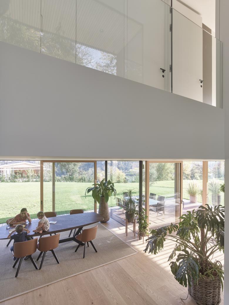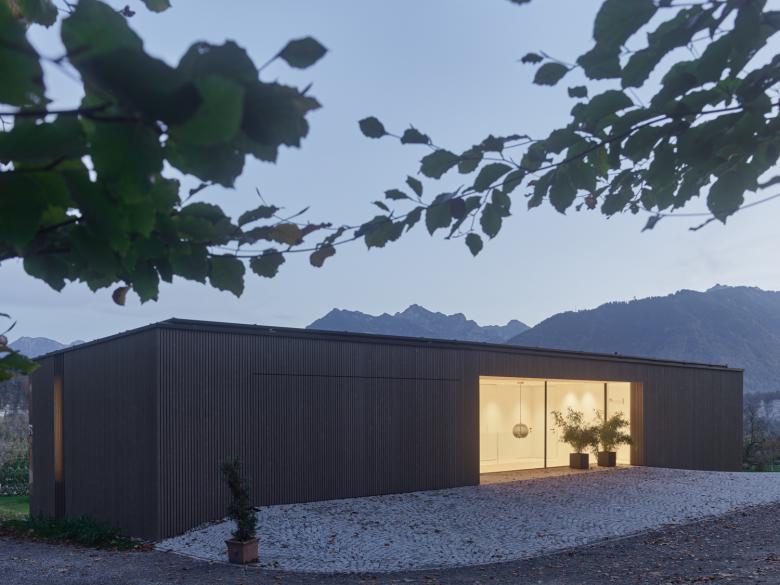 Ein klar geschnittenes Haus unterhalb des Wildparks am Waldrand. Der Rand der Siedlung endet hier und soll durch die neue Bebauung definiert werden. Entlang des Waldfußes gelangt man zum Eingang des Gebäudes. Das Haus ist ganztägig Wohn- und Arbeitsort und bietet Raum für mehrere Generationen. Über zwei Geschosse schaffen Lufträume eine vielschichtige Raumwahrnehmung. Das Haus, seine Zugänge, Blickbeziehungen und Atmosphären schaffen eine natürliche Verbindung zur umgebenden Landschaft, in die es feinsinnig eingebettet ist. Die Raumabfolgen orientieren sich am Verlauf des Lichteinfalls. Besonderes Augenmerk wurde auf den Einsatz ökologischer Baumaterialien und regionale Wertschöpfung gelegt.