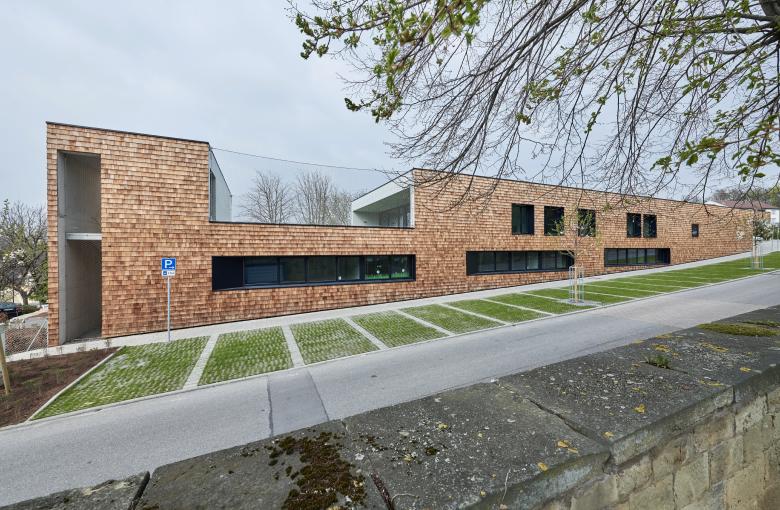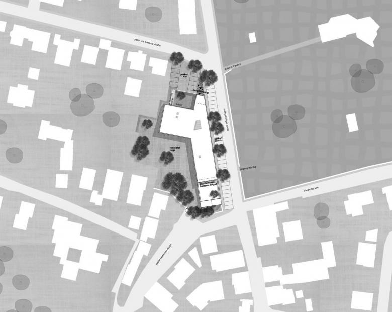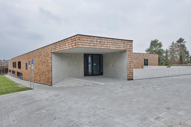Der 2-geschossige L-förmige Baukörper wird mit seinem Längsriegel parallel zur Parkierung angeordnet und der Gehweg wird zwischen Gebäude und Parkierung verlegt. Dies ermöglicht das gefahrenlose Bringen und Holen der Eltern per Fuß, Rad und vom Pkw aus.