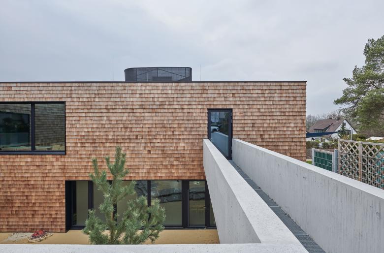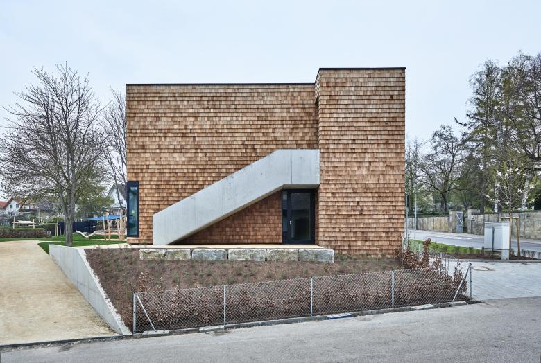 Während sich der Längsriegel des Gebäudes in den Hang hinschiebt verläuft der Ost-West-Riegel parallel zum Hang. Dadurch entsteht auf dem unteren Niveau des Gebäudes ein geschützter Außenspielbereich, der zum Friedhof hin abgeschirmt ist und den Blick nach Süd-Westen frei gibt.