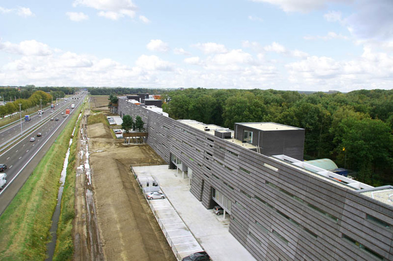 In collaboration with Buro Lubbers, particular attention was spent on the sound barrier. Pine trees were placed in containers on tall pillars in such a fashion that the forest is carried across the noise barrier unto the highway.