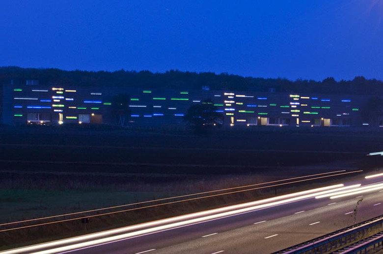 The horizontal window strips in the acoustic wall were completed with LED lights and glow in the dark. A visual wink to a “silent” highway.