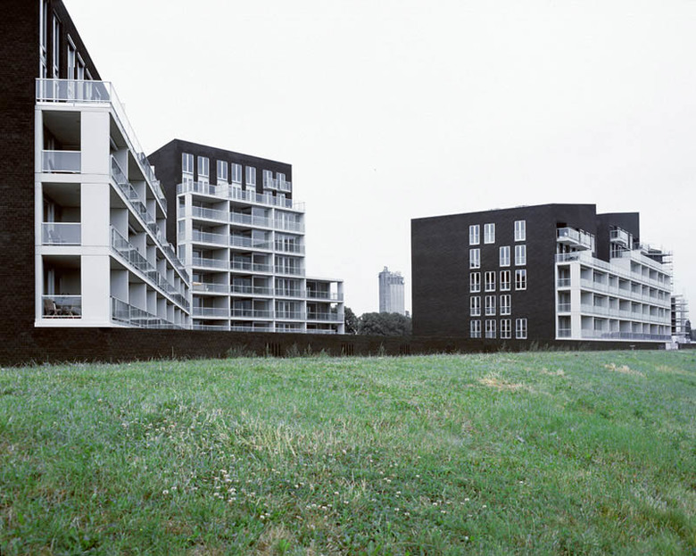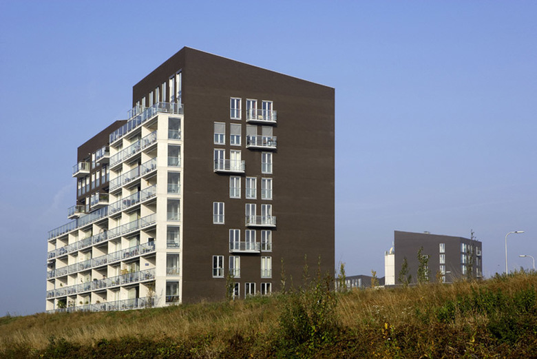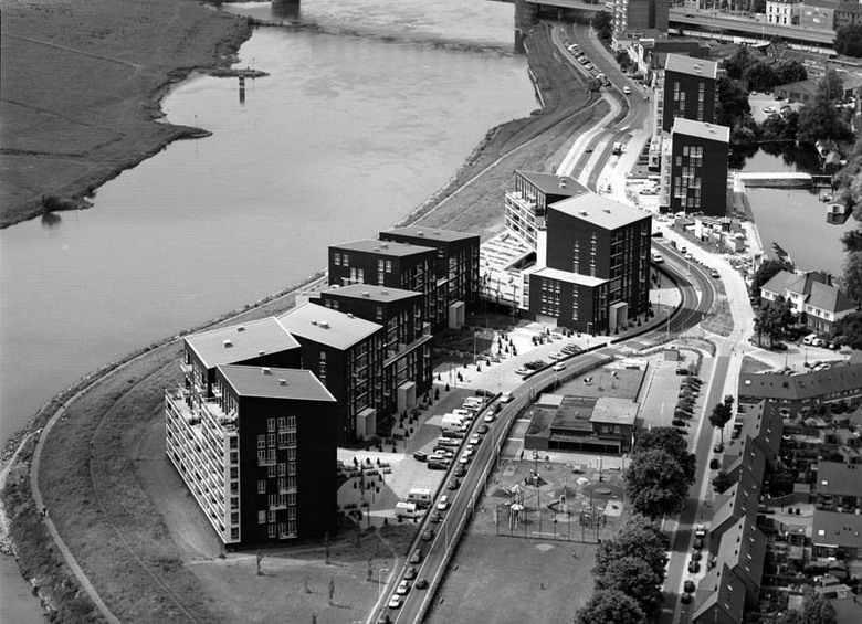 Water has the special force of attraction to stimulate living with a surplus value of a consoling and attractive panorama. Worldwide it is a magnet and connection loop for looks of enjoyment and living pleasure. As an extension to the historical city of Deventer and image to the river, nine blocks of luxury apartments were scattered like dice along the bank of the IJssel. They were connected to each other like couples with large concrete terrace frames and strategically planned with views through to the water. An underground car parking garage slides like a carrier or communal denominator in the bank like a dike for this residence. With rising heights further away from the centre the sloping roof spaces form an interactive game of directions and positions like a nonchalant flirt with the city.