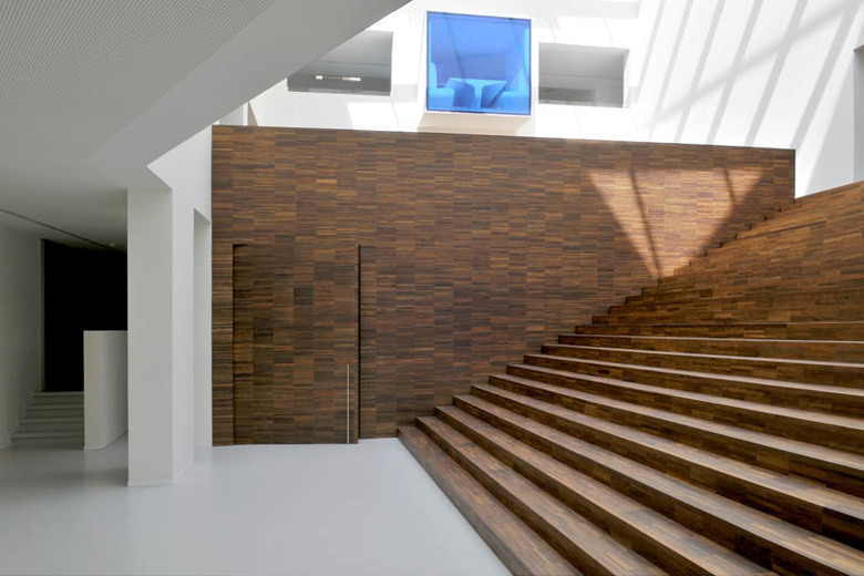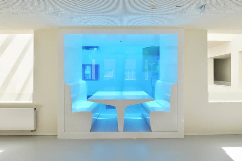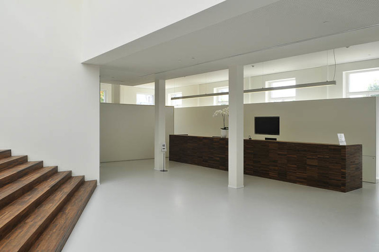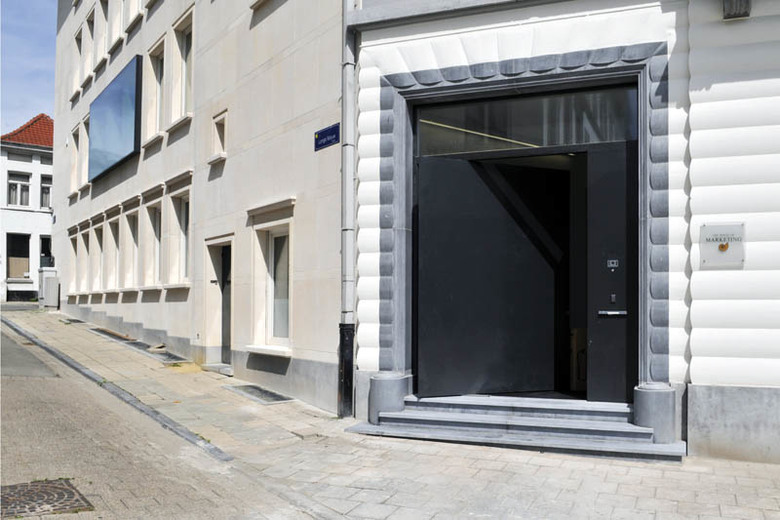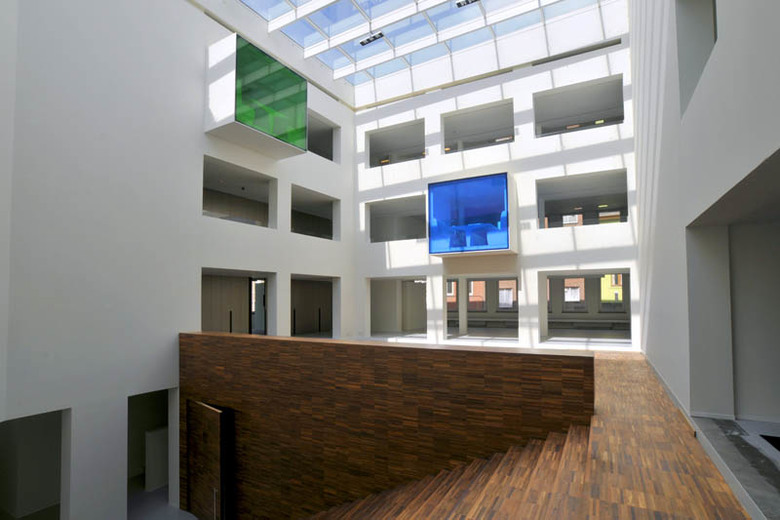 The transformation of the former tax office into a marketing agency. The building is situated at the Kardinaal Mercier square, along the important axis between the Central Station and the old market. The interior area was completely demolished and covered with a glass roof. A new auditorium will be built on the ground floor and cellar level. A monumental staircase leads from the entrance hall to the roof of the auditorium, which gives access to the surrounding offices. Inside, one finds a new, fresh and open interior. Large coloured glass panels are integrated at various locations along the facades.