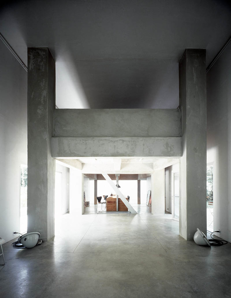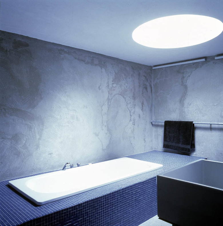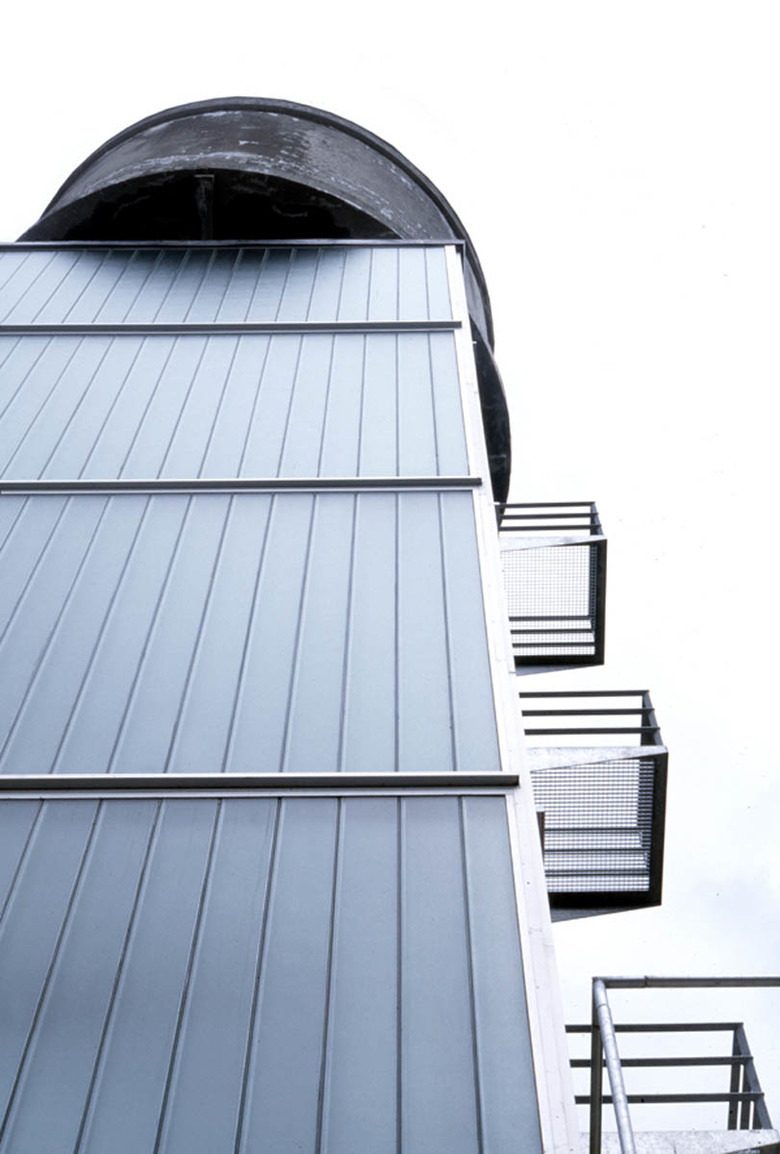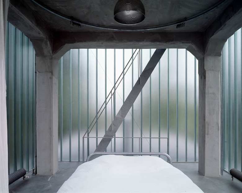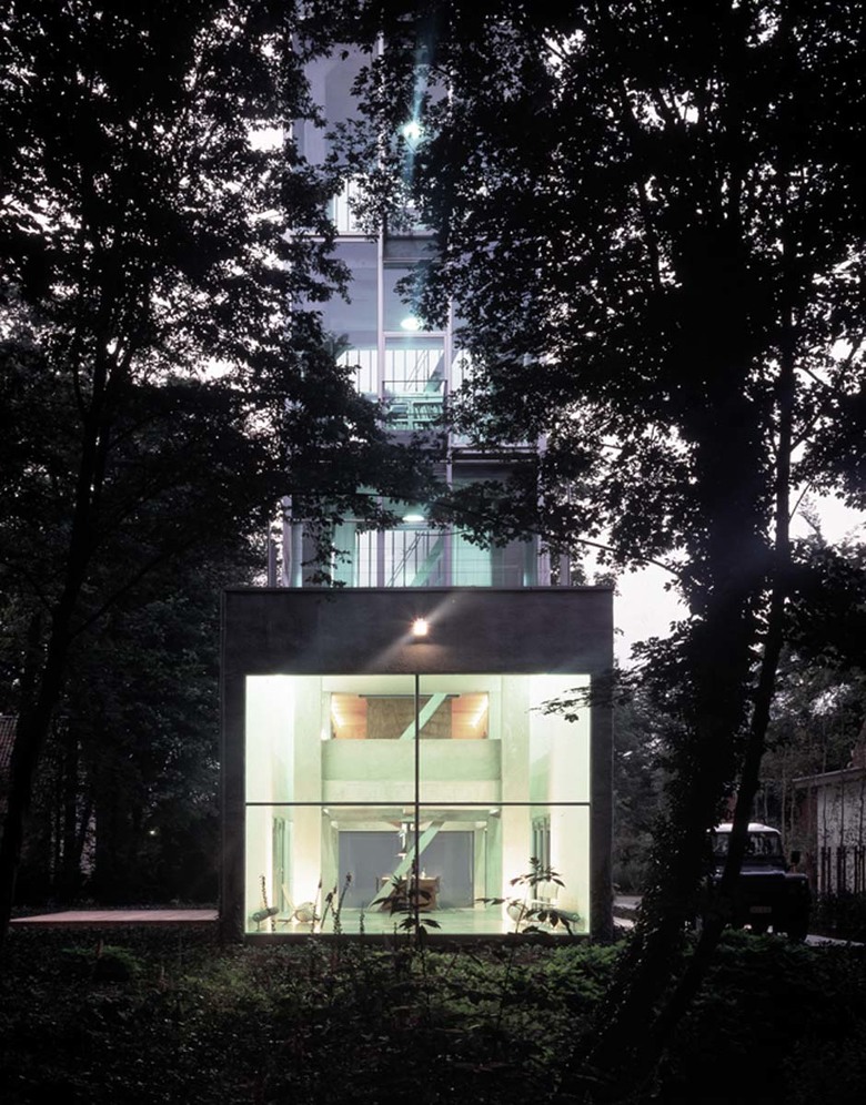 Water towers form part of our industrial heritage – often with the ambition of a second childhood in the long term. The symbolic strength of such a landmark in the landscape thus became a particular challenge as a basic structure for the organization of a family home. The space was reduced to all its naked beauty and clad in a semi-transparent glass covering as an architectural layer and beacon around the rooms of the upper floors. As an anchor and a foot on the ground, the glass tower is supported by a 6 m high living space with a view over the forests of Brasschaat. Steep stairs stand as one high ladder straight through the tower and together with the polished concrete floor reinforce the ambition of an industrial symbiosis between old and new. The cylindrical reservoir remains an untouched crown on this timeless adventure.