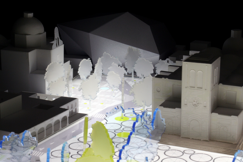 Guzman is located alongside the highway that leads to Manzanillo, a premier beach destination for people living in Guadalajara. The first problem we identified was that it was not a destination in itself, people only stopped in Guzman if they needed gas or supplies. The next major problem was that being known as an educational hub in the region (it is home to ten important universities), it offered no employment for graduating students, so they fled to seek work elsewhere.Guzman has a huge potential to become a destination city because of its many attractions: its undeveloped and almost virgin-like lake, the historic center with its cathedral and many churches, the ten universities and the conglomerate cliffs of the nearby mountains. We identified these specific areas as quiescent spheres waiting to be roused to interact with each other, like atoms in a dormant state before a chain reaction transforms them into energy. This is the concept behind the master plan: to take advantage of the intervention of the Pan-American Games to trigger the potential and the interaction of different areas of the city. The lake has a strong sports vocation but the cultural and environmental potential can’t be ignored. That’s why a series of diverse focal interventions were planned to take advantage of these aspects: a school for the arts, a gastronomical center, housing units, a hotel, a cultural center.The master plan was intended to regenerate a dried-up river and a forgotten canal that cross through the city and turn them into linear parks that promote diverse sporting and cultural activities. Guzman lacks a proper entrance from the highway so it is very easy to miss. This was a crucial problem to be solved with a striking landscape intervention.We proposed to gradually discourage car use by pedestrianizing most of the city center streets and restricting cars in others, rerouting the principal avenues to avoid the center and creating a bicycle rental program to encourage their use.Another major problem to attend to was the limited number of hours people spent in the center due to monopolization by commercial use. In order to combat this we encouraged a mixed and varied use through the reincorporation of residential, office, restaurant and bar use.
