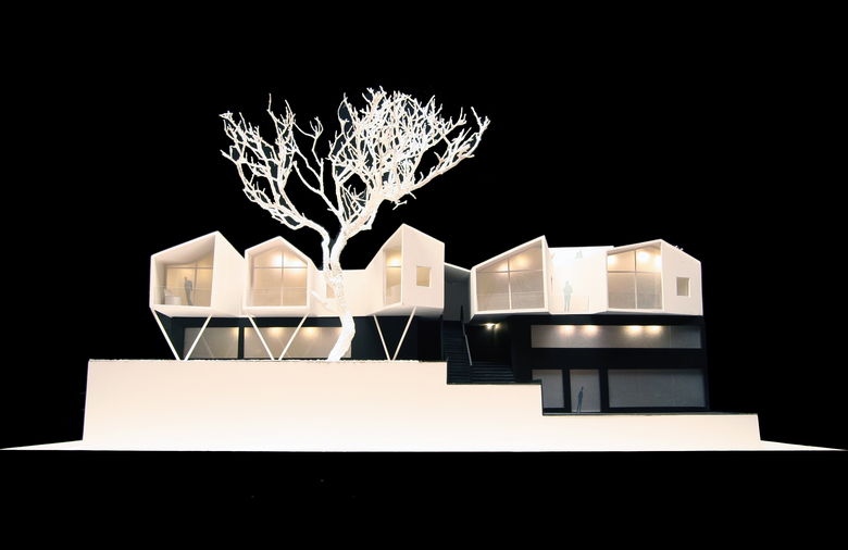 The program required that the father’s two apartments be restricted to his plot and the remaining three to the other. It also asked that they have the appearance of a uniform project but function as two separate and independent buildings. All the apartments would share the common garden.