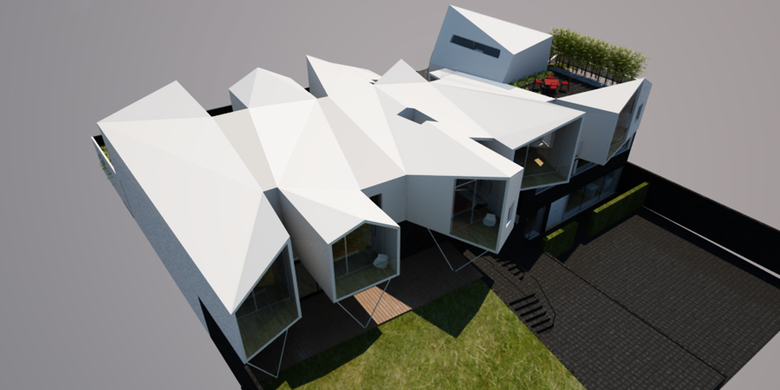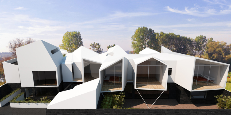 In order to alter the volume’s boring flatness and mimic the mountains lying in the background, the vertices were raised randomly to produce a wrinkled surface that unites the two buildings.