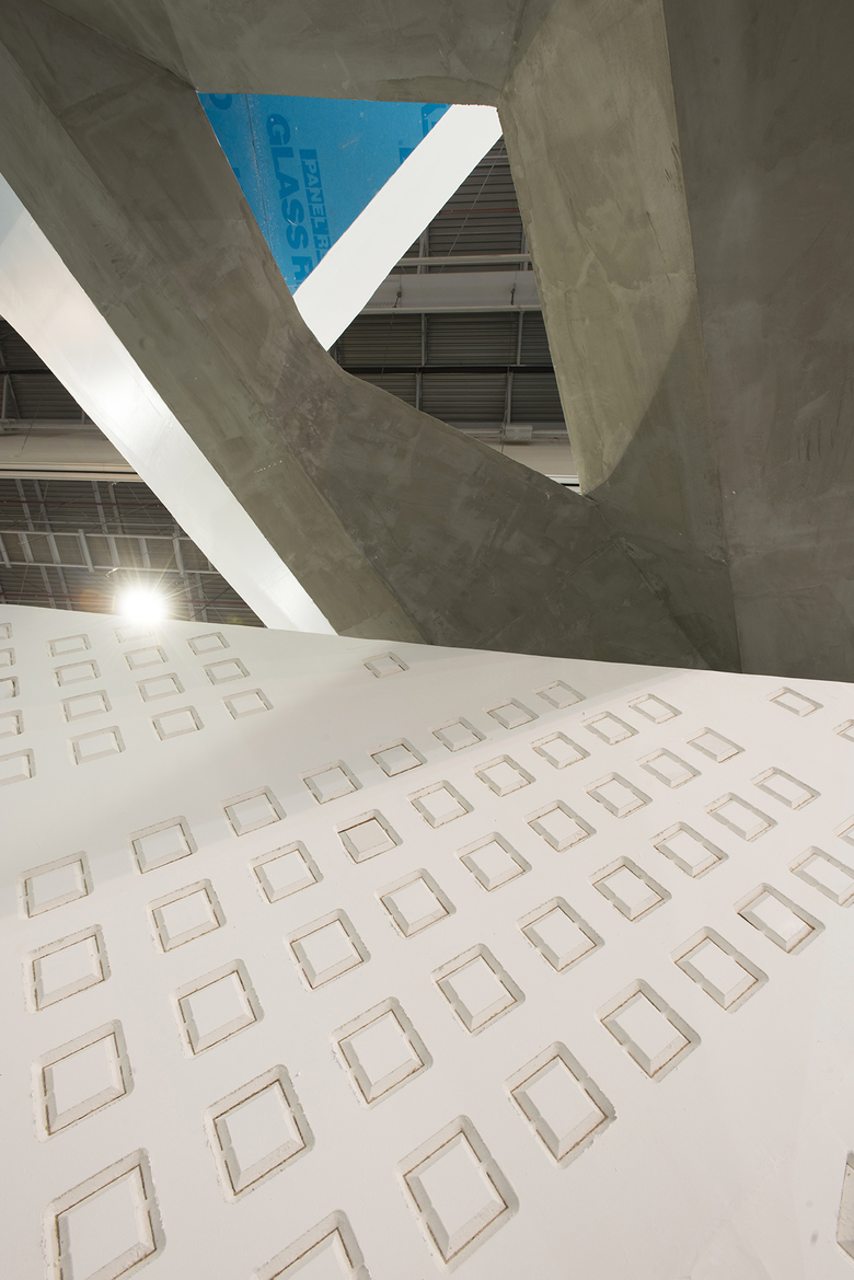 With this in mind, we approached the CEO of Panel Rey and convinced him to confront his competition by commissioning us a pavilion that would push the limits, design-wise, of what could be accomplished with gypsum panels. We partnered with Sanzpont [arquitectura] for this project and together we generated a whimsical and outgoing way to seek attention and leave behind the monotony of the exhibition halls. The pavilion is formed by a number of flat triangles that intersect in space to create an arch framing the central area while a six meters long cantilever protrudes over the top. The outside of the exhibition stand is covered with gypsum panels, the back column and the cantilevered structure are covered with exterior panels (Glass Rey) and the inside frame is covered with cement panels (Permabase).