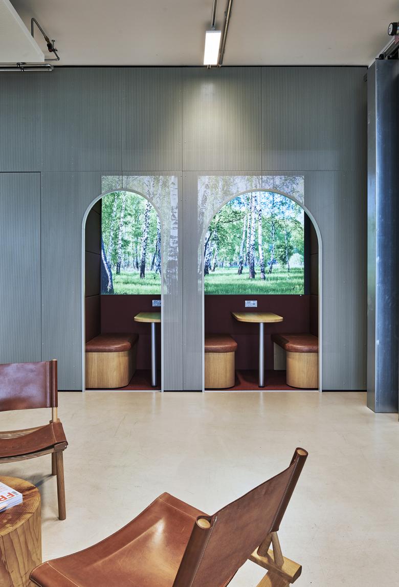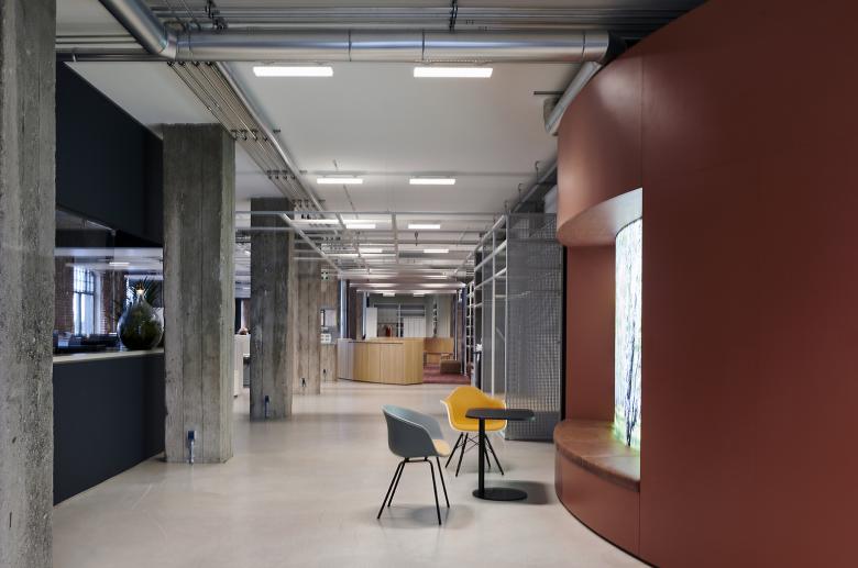 Within the framework of the historical warehouse halls, brandherm + krumrey developed a customised interior design for Birkenstock’s diverse requirements. The headquarters of the international fashion brand in the Rheinauhafen quarter provides over 2,000 square metres of open-plan office space for creative work. Around 150 fixed and flexible workstations are distributed over the ground floor and the four upper levels. Instead of open-plan offices, individual areas were created to cater to different needs. Particularly impressive are the ground-level Halls 11 and 12, for which brandherm + krumrey designed a modern working environment with a showroom. A historical cross vault and round columns made of reinforced concrete characterise the evocative ambience of Hall 11. Here, glazed and closed cubicles accommodate functions for individual and team work or meetings, so that the spacious impression of the room is maintained. Loosely arranged display furniture is additionally used as storage space for office purposes and as plant shelves. Showroom areas for the world-famous shoes were also created in the neighbouring Hall 12 and combined with workplace functions. New Work tables specially designed for the project complete the ensemble of high-quality furniture and carefully chosen materials. The centrepiece of the interior design are two circular, open meeting zones with seating arrangements and upholstered furniture that invite relaxed exchange in a special atmosphere.