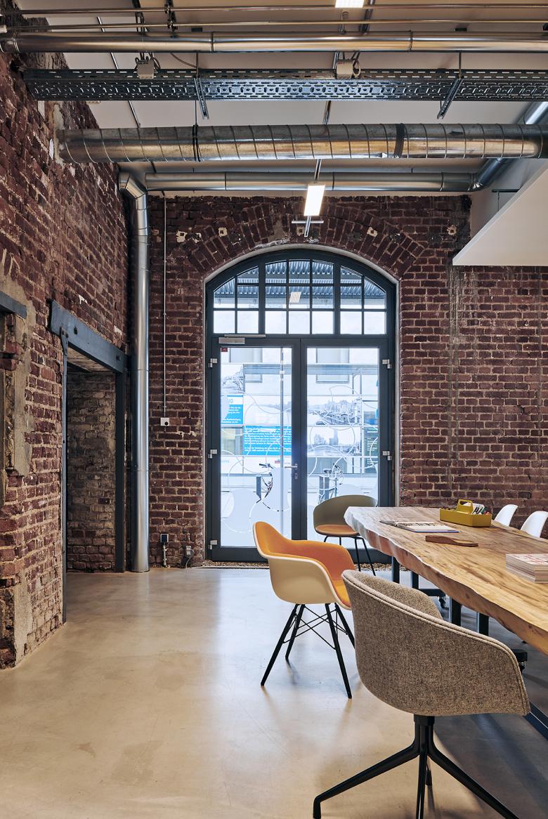 How can open meeting and office spaces for modern forms of work be integrated into a historical harbour warehouse? This was the exciting task facing brandherm + krumrey when designing the headquarters of the Birkenstock Group in Cologne. Areas for office work, meetings and coworking along with a lounge, café and showroom were to be accommodated in a former customs and warehouse dating from 1898. The elongated building in Cologne’s Rheinauhafen was originally used to store oils, fats and petroleum. Today, the imposing building is part of the ensemble comprising restored heritage buildings and modern architecture such as the well-known Kranhäuser (‘crane houses’) that characterise the old harbour area in the cathedral city.