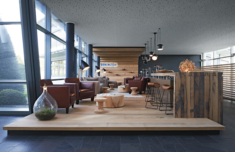 In the central foyer, a lounge was designed which forms an exclusive space within the expansive entrance area. Here, the selected materials of wood, leather and cork make a particularly high-quality impression. The harmonious arrangement of chairs, seating furniture and furnishings creates a pleasantly cozy ambience and encourages visitors to linger. This impression is enhanced by the parquet flooring, which rises in the rear area, curves up toward the ceiling and encloses the room like a wave. Finely crafted leather boards are integrated into the curved back wall. These present the BIRKENSTOCK product highlights. A long piece of display furniture, customer made from wood 100 years old, acts both as presentation area and as space-defining component: Selected BIRKENSTOCK models are positioned on delicate struts here; and it also provides a logical separation between the interior area of the lounge and the expansive entrance hall.