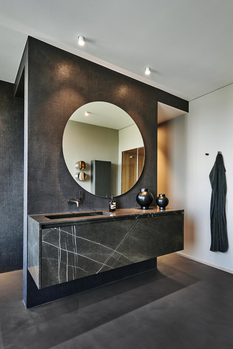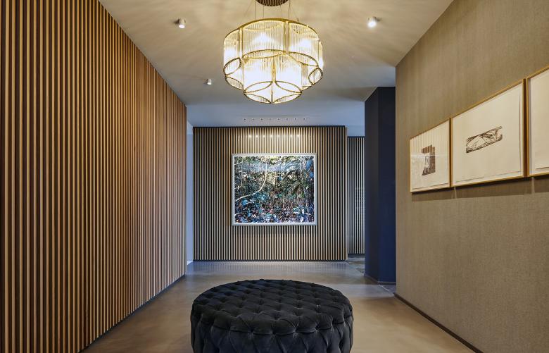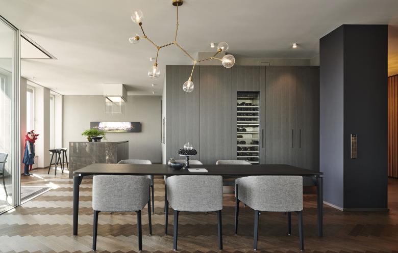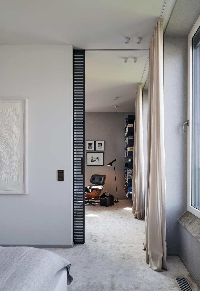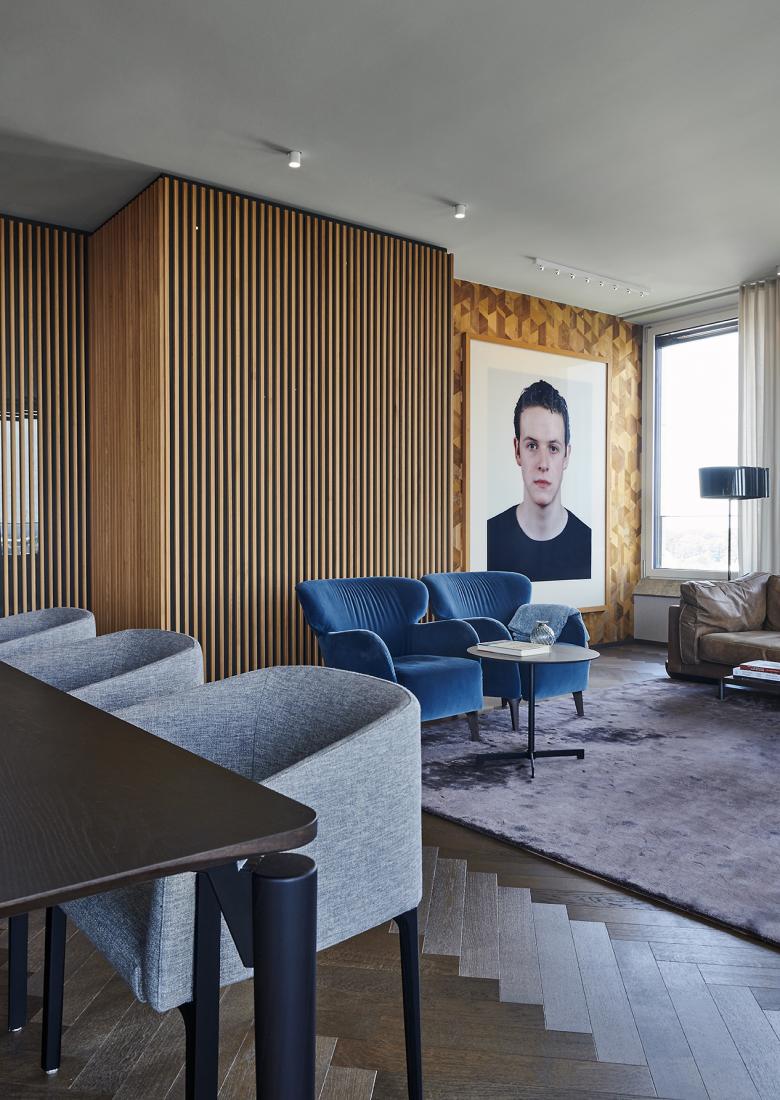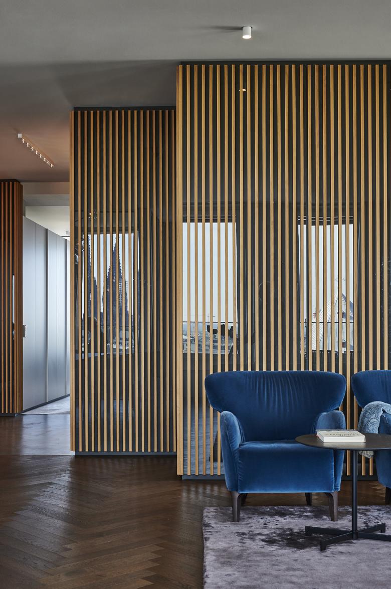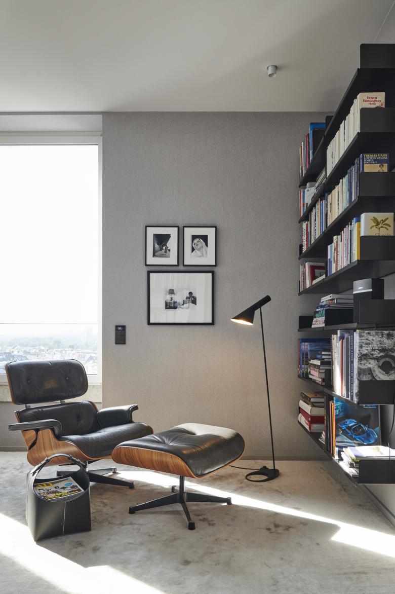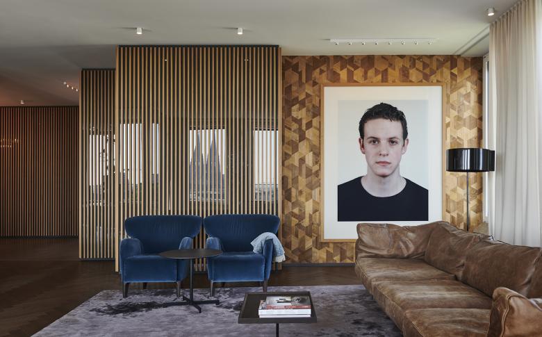 When brandherm + krumrey was commissioned with the interior design of the condominium in the Gerling Tower, the interior architects began by rearranging the room layout. The challenge here: on the one hand, she had to follow the very strictly structured external façade with its grid, axes and a circumferential window front. On the other hand, a homely cosiness was to be created in the newly laid out rooms. Since balconies were of course not considered for the high-rise building, which was originally designed as an office complex, two interior loggias now provide airy open spaces. The second challenge the interior designers had to solve: the 180-square-metre condominium was to be designed as a stage for the collected works of art. And the third challenge: the furnishings had to take up the design and material vocabulary of the 1950s and translate it into modern times. brandherm + krumrey used plenty of natural stone and wood in combination with muted colours. This results in an elegance that reflects both the aesthetics of the historical building and the attitude of the residents.