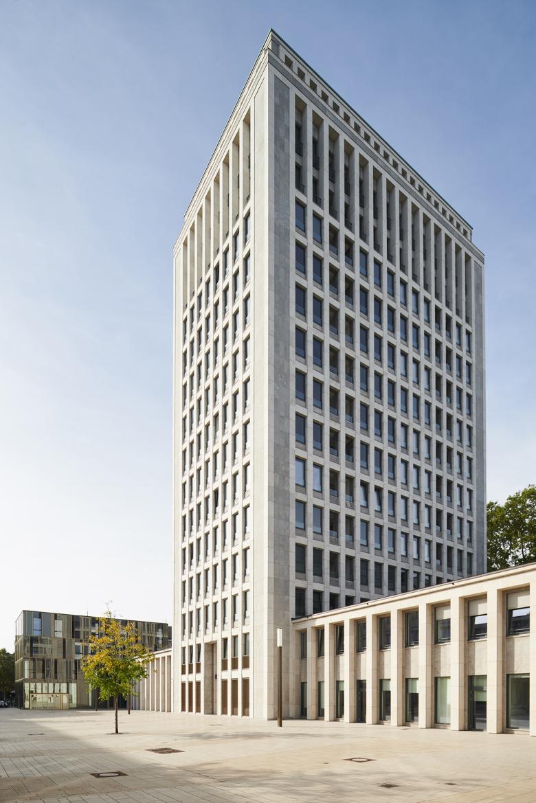 When the Gerling Tower was built between 1950 and 1953 in the centre of Cologne, it was soon considered a sensation. No other building was higher. Only the nearby Cologne Cathedral could rival it. The entire ensemble, which the Gerling Group, a multi-line insurance company, had built as its headquarters over decades, was designed in a classicist style – with a square culminating in the 17-storey high-rise. The filigree, 56-metre-tall steel skeleton structure tapers slightly towards the top and has a grid-like façade with a shell limestone cladding. Offices and flats have been realised in this historical ambience from 2007 onwards. Since the façades and parts of the interiors are under a preservation order, the buildings were carefully – and where possible – gutted and the majority of the interior spaces were redesigned.