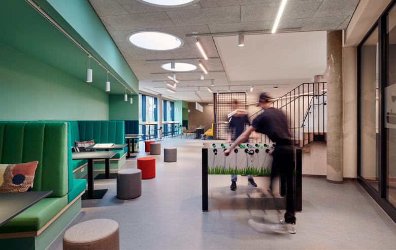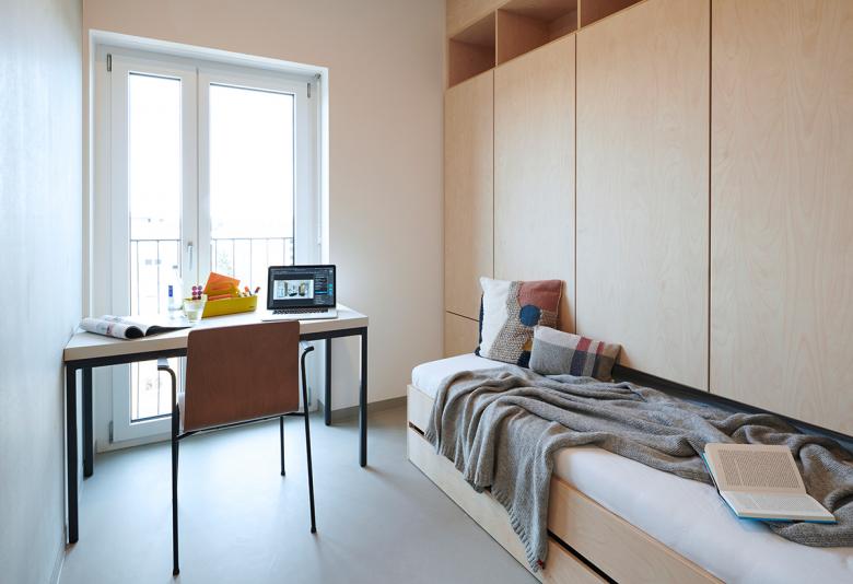 Gemeinsam Wohnen – Das von uns gestaltete Interior Design für das Studierendenwohnheim in Reutlingen beruht auf der Idee einer Wohngemeinschaft. Neben den 182 Zimmern sorgen großzügige Gemeinschaftsflächen für einen regen Austausch der Bewohnerinnen und Bewohner untereinander. Jede der offenen Flächen hat eine persönliche Note, um ein Wohlfühlambiente zu schaffen. Leuchtend warme Farbtöne prägen die Co-Living-Flächen und sorgen für eine bessere Orientierung. Das Studierendenwohnheim der GWG – Wohnungsgesellschaft Reutlingen mbH wurde nach einem Entwurf des Architekturbüros be_planen errichtet. Der klassische Eingangsbereich im Untergeschoss bildet ein freundliches Entree ins Gebäude, das auf allen Etagen offene Kommunikationsflächen bietet. Für jeden Anlass des Zusammenwohnens gibt es einen eigenen Bereich. So befindet sich im Untergeschoss die Gemeinschaftsküche mit einer Loft-artigen Fläche, die zum Essen oder auch zum Lernen genutzt werden kann. Die Bibliothek lädt mit Lesekojen in ruhigem Blau zum konzentrierten Arbeiten ein. Wer sich zurückziehen möchte, findet in seinem Apartment eine Küchenzeile und eine Nasszelle. Die Einrichtung verbindet ein klares und zeitloses Design mit warmen Holztönen für ein wohnliches Ambiente. Ausziehbare Betten und Einbaumöbel sorgen für eine optimale Nutzung der vorhandenen Zimmerfläche. Zwischen den einzelnen Wohneinheiten befinden sich Co-Working-Spaces für das gemeinsame Studieren. Die einladende Atmosphäre mit farbigen Nischen und Sitzpolstern fördert auch hier eine lebendige Gemeinschaft.