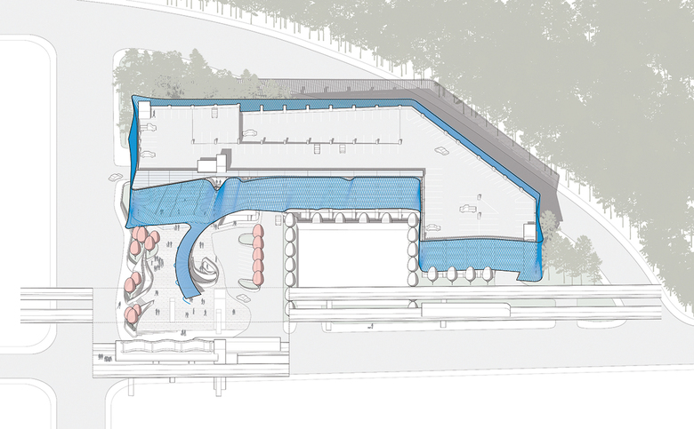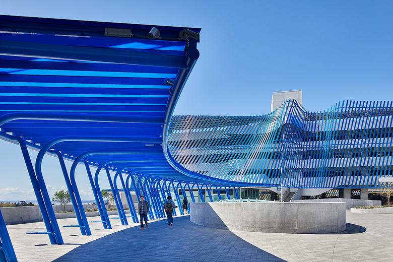 With five levels above ground and two levels partially below ground the mixed-use structure takes advantage of the sloping site topography. It is accessible from three different street locations at various levels with 2,500 square feet of retail space at ground level and a 35,000-square-foot site to the west to support future transit-oriented development. As part of a multi-modal transit plan the station also has secure storage for bicycles with integrated lockers and racks and charging stations for electric vehicles.