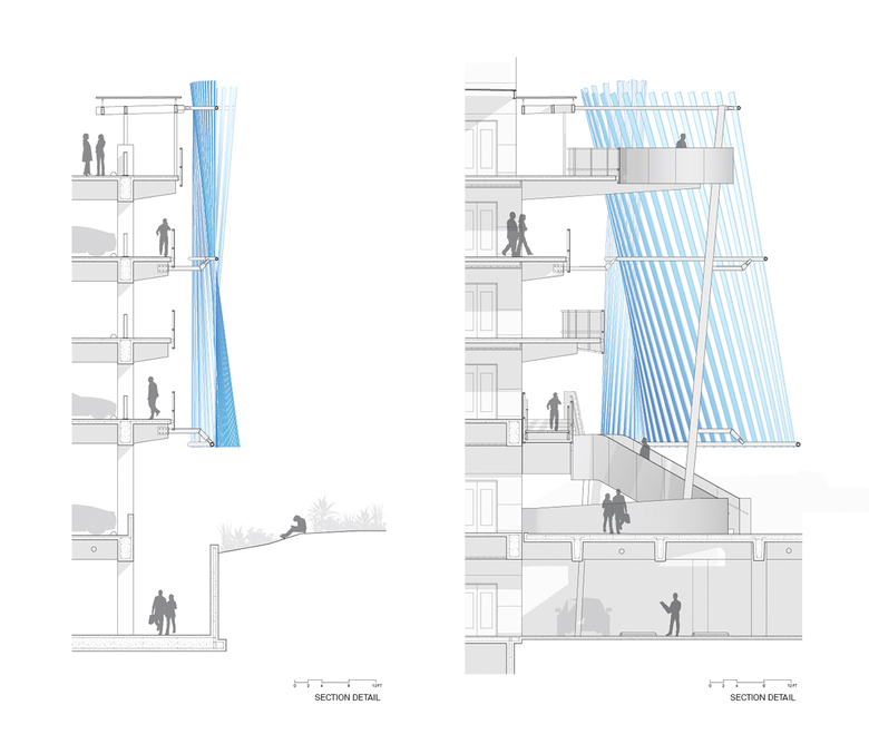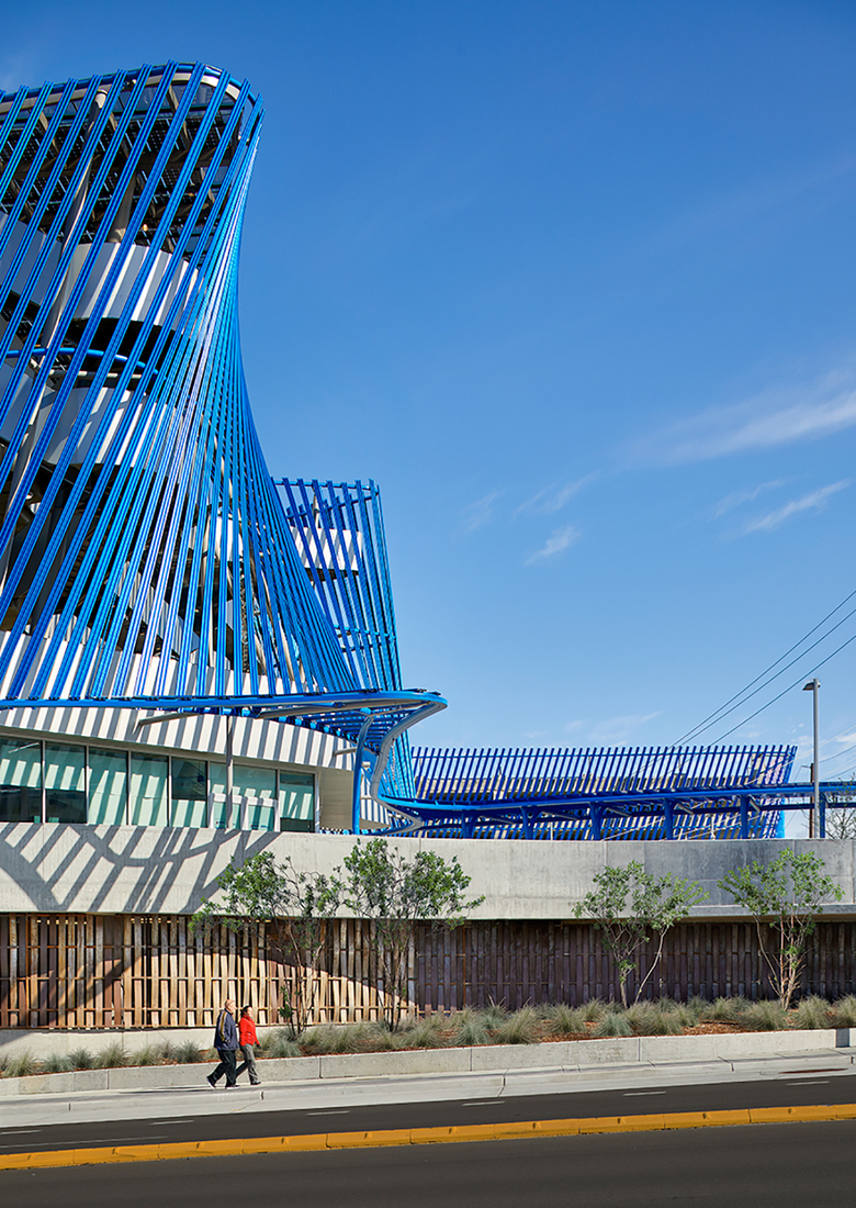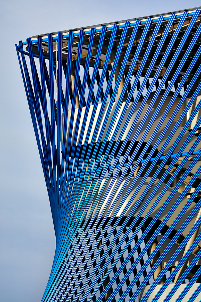 The seven acre 400,000 square foot mixed-use complex was the result of an international design/build competition. It features a seven-story, cast-in-place and post-tensioned concrete structure with an exterior façade that uses over 7,500 custom formed blue anodized aluminum façade panels. Using ruled surface geometry, the undulating façade is formed by connecting two curves with a series of straight lines to form the surface of the façade. Each of the custom aluminum façade elements were designed and segmented into standardized sizes for the most efficient structural shape and material form, while maximizing production, fabrication and installation cost efficiency. This technique allowed the design team to work with complex curved forms and rationalize them into simple, cost-effective standardized components, making them easy to fabricate and efficient to install. The entire façade was installed in less than three weeks without the use of cranes or special equipment.
