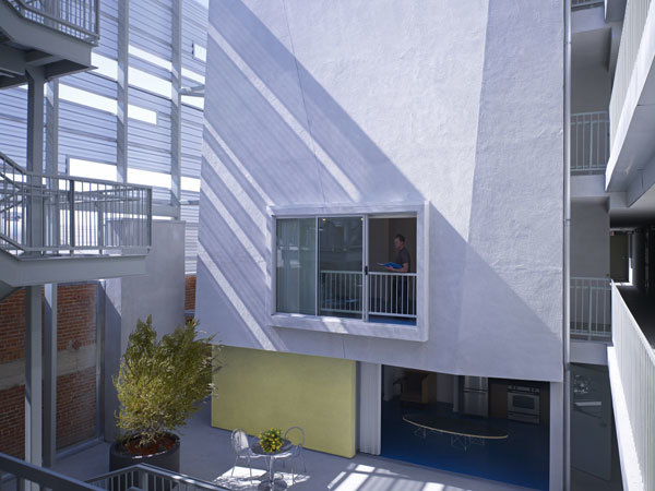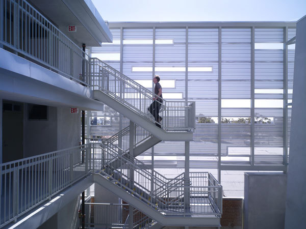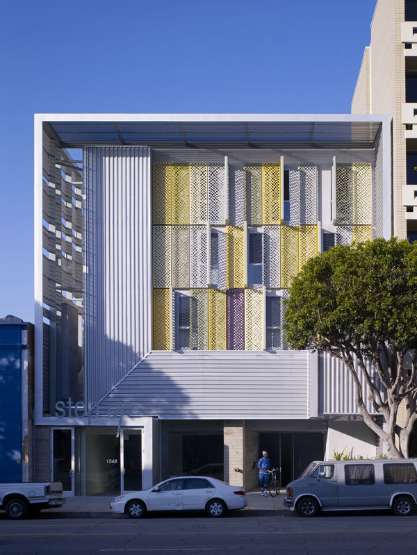 A striking yet light-hearted exterior makes the new building a welcome landmark in downtown Santa Monica. Custom water jet anodized aluminum panels on the main façade creates a dramatic screen that sparkles in the sun and glows at night, while also acting as sun protection and privacy screens. The material reappears as a strategic arrangement of screens on east and south-facing walls, lending a subtle rhythm to the exterior circulation walkways and stairs. South-facing walls filter direct sunlight with asymmetrical horizontal openings that lend unexpected visual depth while creating a sense of security for the emotionally sensitive occupants. Enhancing the structure's geometric texture, the irregular array of openings variably extrudes from the building's surface.