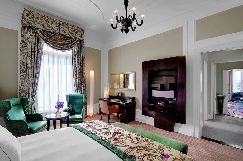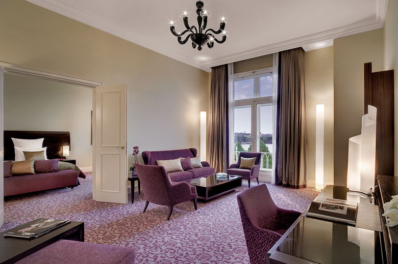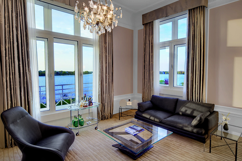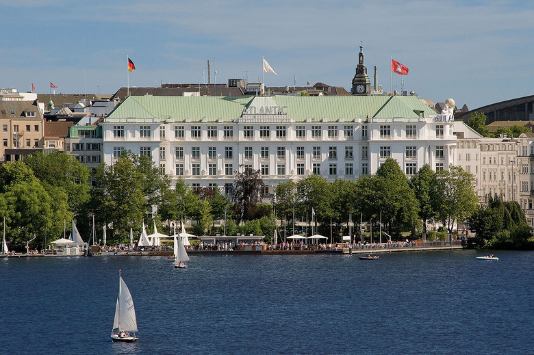 The design draws on the over 100-year history of this institution as a grand hotel for passengers aboard the transatlantic luxury liners and on Hamburg as a gateway to the world. A range of different décor worlds can be seen on the individual floors. The second floor is inspired by Africa, with earthy shades and colours of the desert. On the third floor, blue shades and glimmering silver ornaments on brocade remind one of Europe's Belle Époque. Vivid shades of violet and large-scale geometric patterns on the fourth floor are a reference to the Art Deco of 1930s America. On the fifth floor, red and gold shades and silk fabrics dominate as an homage to Asia. In the Atlantic Suite, over 100 square metres in area, the modern luxury of this grand hotel is shown to full advantage with its hand-made, extra soft carpeting, and curtains made of Rubelli silk and other materials of high quality, in combination with modern art and designer furniture.