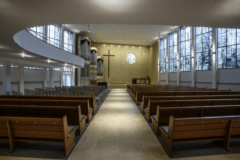 After 65 years of use, the building was once again adapted to contemporary parish use as part of a comprehensive renovation and modernisation – in close consultation with the responsible monument protection office. Necessary installations were sensitively integrated into the existing interior architecture and room configuration. The new family rooms on the ground floor are particularly noteworthy here.