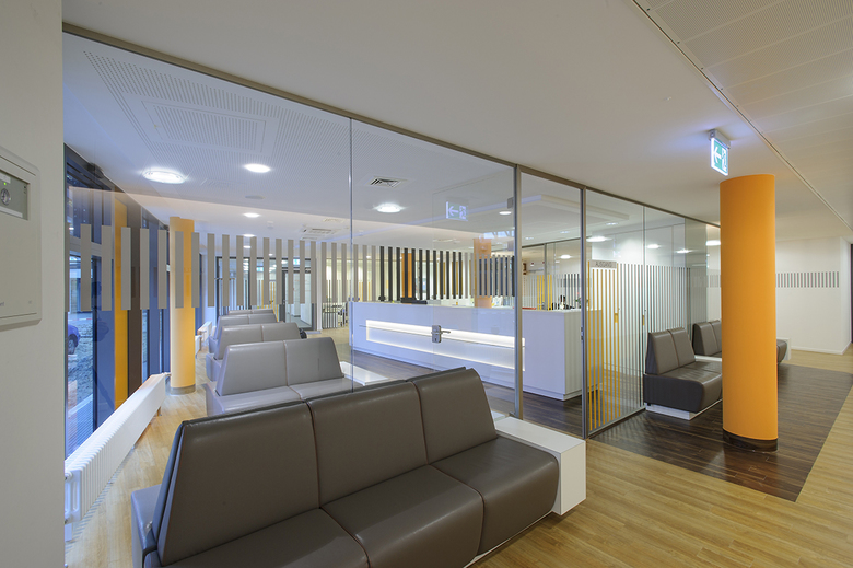 Der Entwurf hat zwei Hauptmotive – zum einen finden sich die vertikale Streifengrafik des Gemeinschaftspraxis-Logos an den (Glas-) Wänden als Sichtschutz und zur Einbettung des Leitsystems (Raumbeschilderung) wieder. Die Farben des Praxis-Logos – orange und grau – setzen die Akzente im Raum. Zum anderen zonieren Tresen und Schrankrückwandelement auf weiße Körper reduziert den großzügigen und hellen Empfangsbereich zur klaren Wegführung für die Patienten.