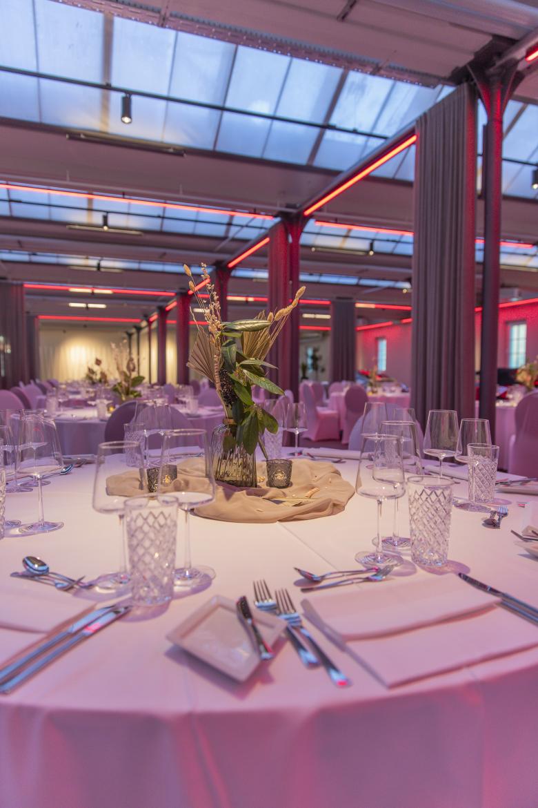 Die Eventlocation kann durch individuell ansteuerbare Beleuchtung in jeder Farbe in Szene gesetzt werden, um für jeden Anlass die passende Atmosphäre zu schaffen. Zusammen mit der indirekten Beleuchtung der Sheddächer und den Strahlern, die sich im Ausstellungswinkel frei einstellen lassen, ist eine flexible Beleuchtung der Alten Weberei garantiert.