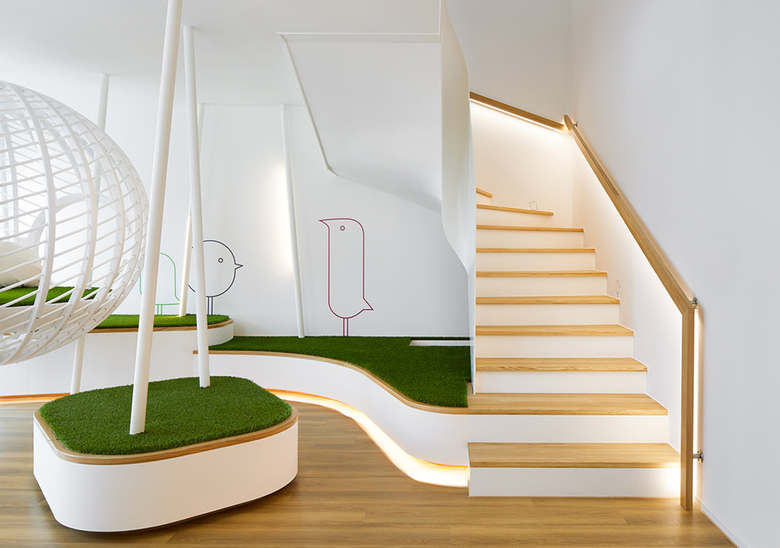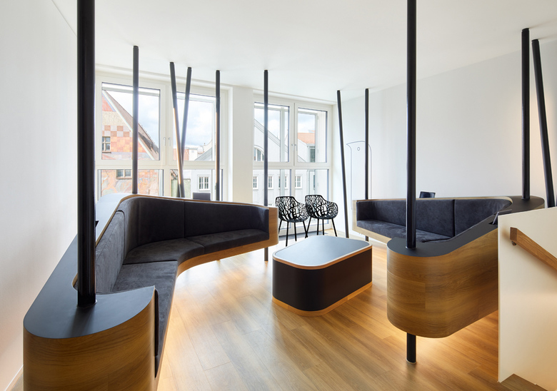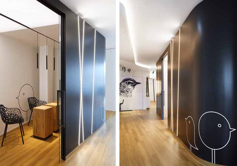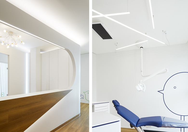 Eine Innenraumgestaltung, die Kindern dabei helfen soll, ihre Ängste vor dem Zahnarzt zu verlieren, ist in der Praxis Max 23 gelungen. Das Gestaltungskonzept greift die Themen Natur und Wald auf und setzt sie in einer abstrahierten Formensprache um. Höhepunkt ist ein begehbares Vogelnest. Die Beleuchtung nimmt sich bewusst zurück, ist zumeist in Fugen platziert und unterstützt die gestalterische Ausdruckskraft der Innenarchitektur dezent aus dem Hintergrund. Eine Ausnahme bildet die Beleuchtung des Besprechungsraums: Hier sorgt eine Lichtdecke in Kombination mit geschlossenen Deckenfeldern für ausdrucksstarke Licht- und Schatteneffekte. Verbindendes Element ist eine Schattenfuge, in die Downlights und Pendelleuchten eingesetzt sind.