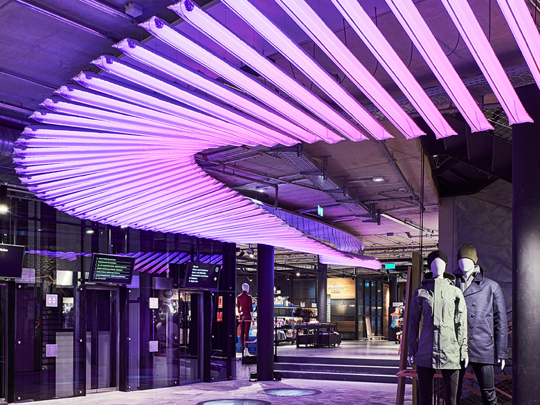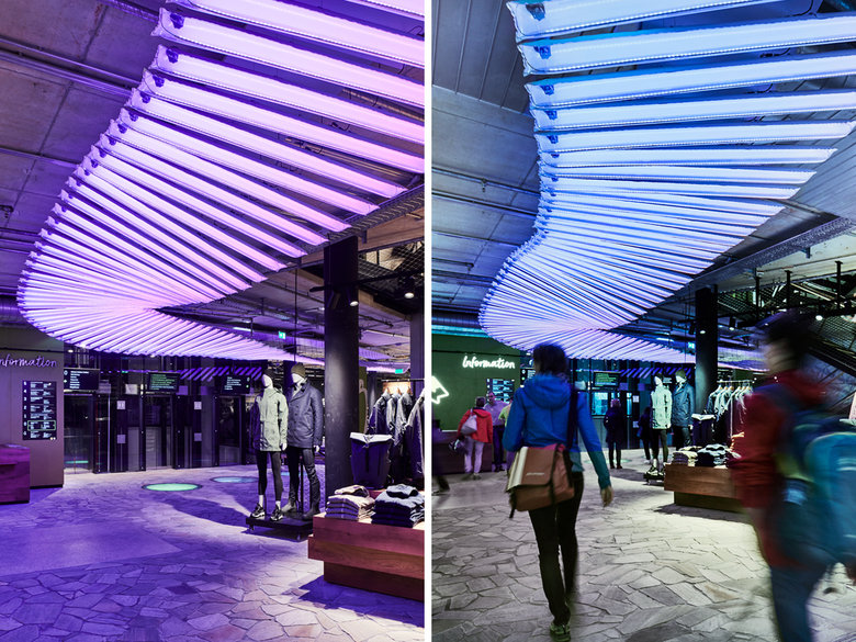 Eine wegweisende Lichtkunst-Installation entstand für das Münchner Traditionssporthaus Schuster. Seit 2018 weisen dort 102 eigens für das Projekt entwickelte, aufblasbare Lichtelemente den Besuchern den Weg ins Innere. Gefertigt sind sie aus LKW-Planenmaterial. Entworfen wurde die sanft geschwungene und von der Decke abgehängte Lichtkunst-Installation in Zusammenarbeit mit Ingo Maurer, als eines der letzten Werke des großen Münchner Lichtkünstlers. Da jedes Lichtelement mit ansteuerbaren RGBW-LED-Streifen ausgestattet ist, lassen sich im Handumdrehen wechselnde Lichtstimmungen programmieren.