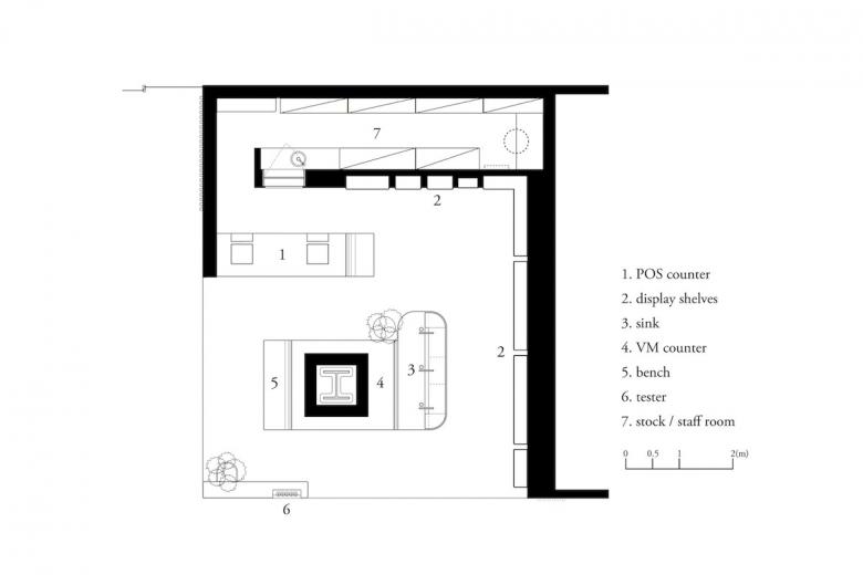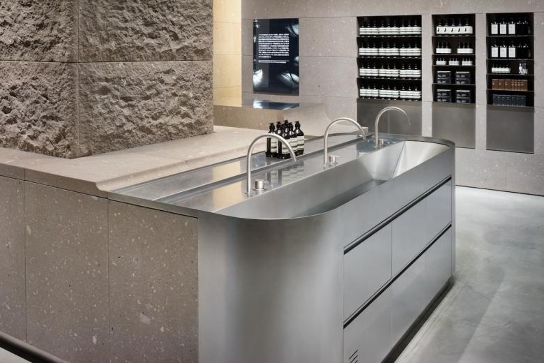 For the display shelves and other fixtures where function is needed we will use vibration finish stainless steel which incorporates with the grey color of soft stone well. We aimed to portray the man made artifacts co-existing with the harsh side of nature, also considering the entire store atmosphere a single saucer to catch all the products shown.