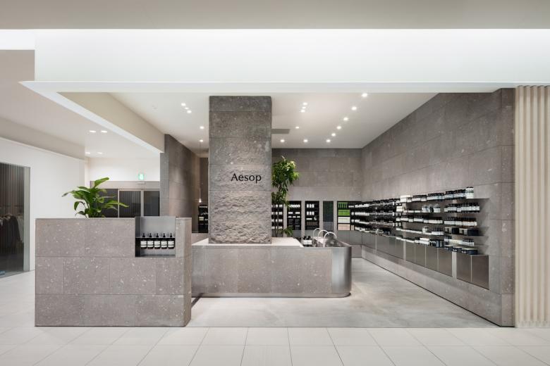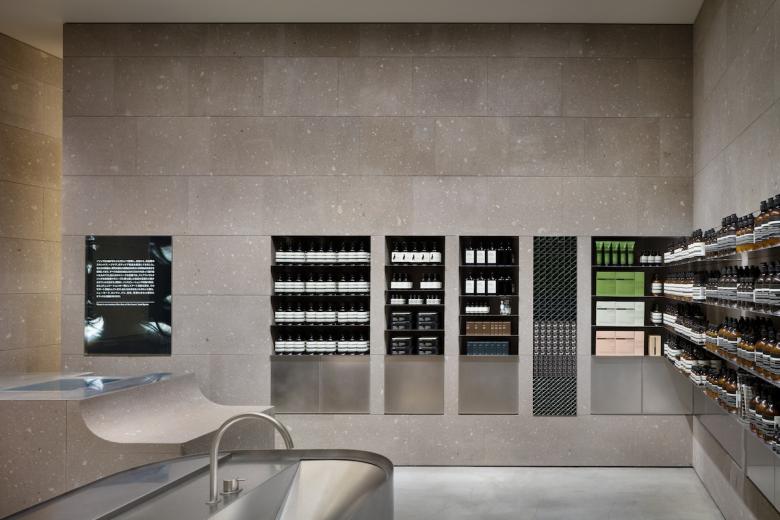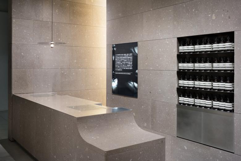 A primeval forest of white birch in snow. Mountains also topped with snow are covered with fog creating a vague outline surrounding the city…with the architecture and man made artifacts within. For this store, we aimed to portray the poetic and scenamatic atmosphere which can be found in Sapporo, or even broader in the Hokkaido Prefecture. These are scenes that withhold contradictory elements, which are at the same time dynamic but somehow fragile, with a sense of roughness but also delicate, and in pale darkness but with sunlight. We believe that this will contemplate well with the Aesop products as its backgrounds.