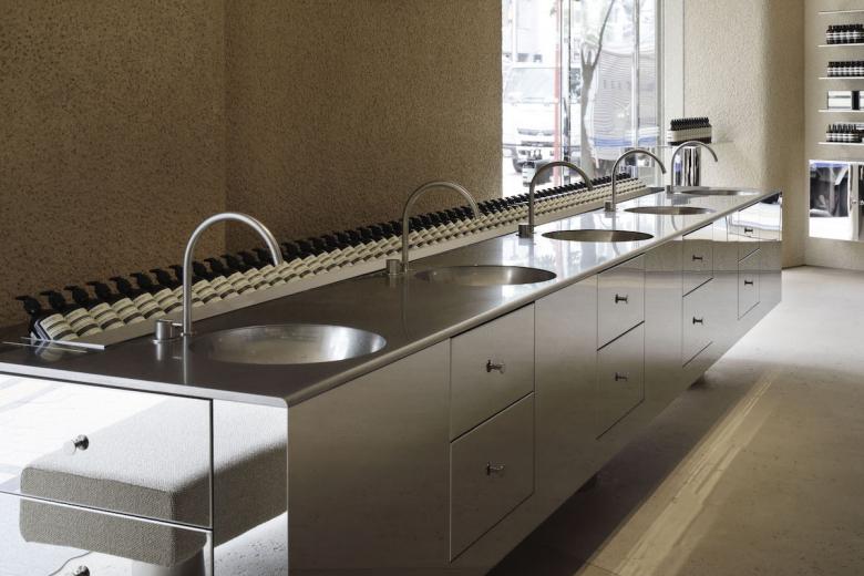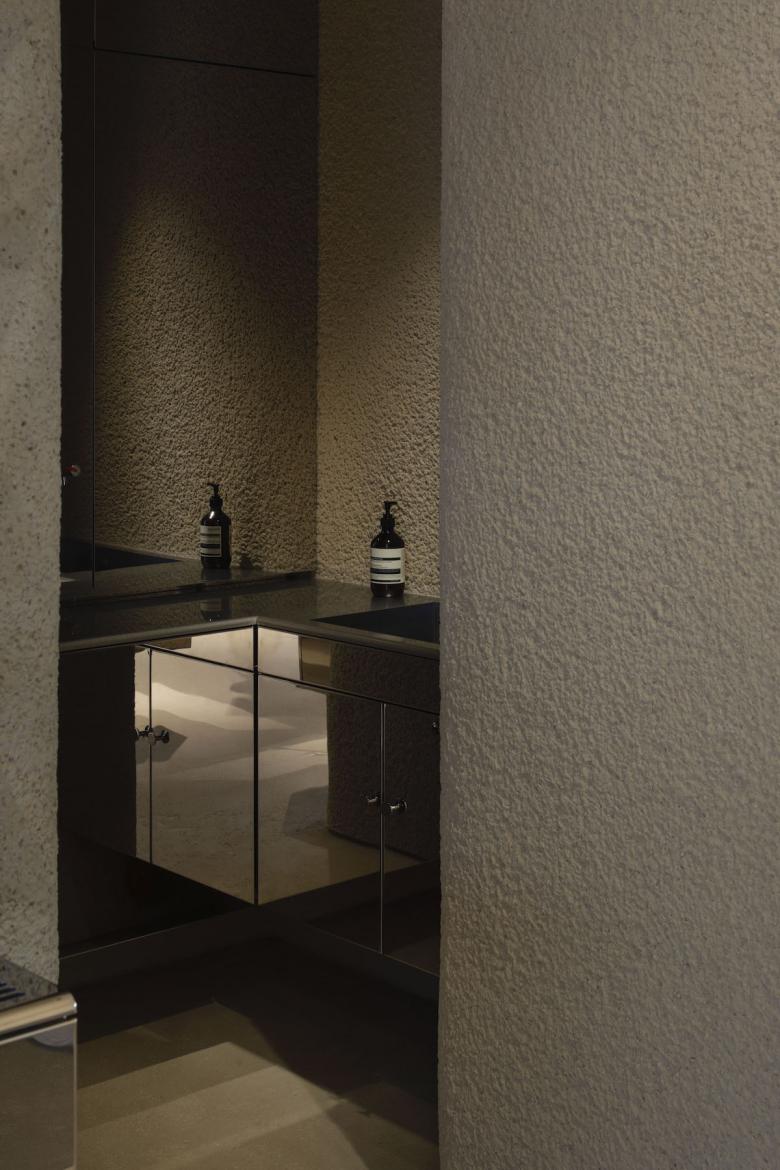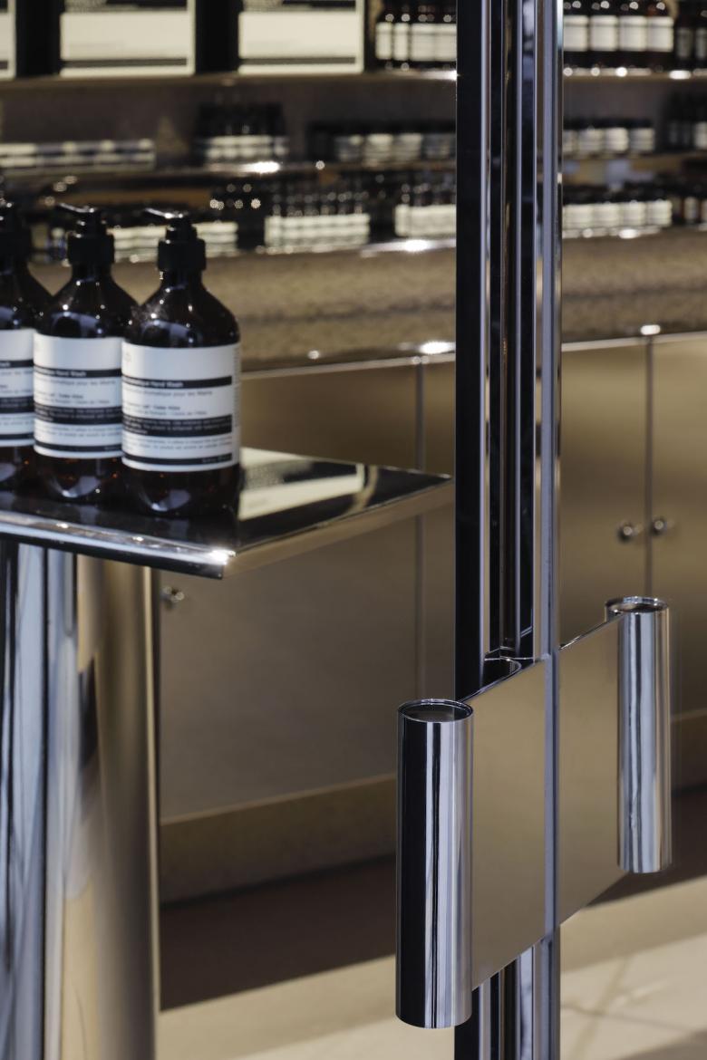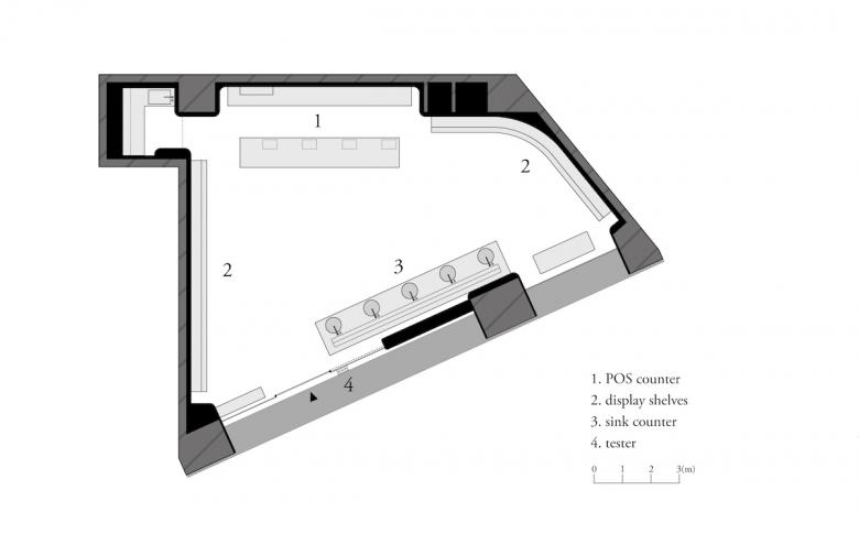 A jungle of buildings, small alleys with extreme density, and the cities atmosphere of glittering neon-signs. Sihinjuku is always a city with an image of artificial chaos, but also with a nostalgic 80’s atmosphere, and a human-like feeling. We came upon the idea creating a store that can merge this kind of Shinjuku atmosphere, with the opposite natural and generous feeling the Aesop brand has. Cold but warm, new but nostalgic. A place that functions as a new retreat in such city. We chose stainless steel with a mirror finish for the main material. Chipped plaster walls finished with a rough expression, combined with a glorious artificial volume of stainless steel will be applied to create a shop space that is distinct to Shinjuku but also reflects the Aesop brand through its design.