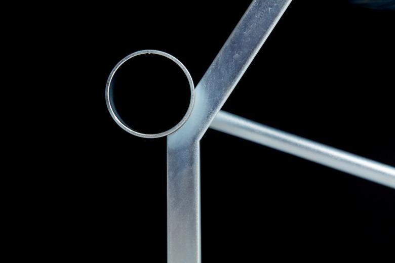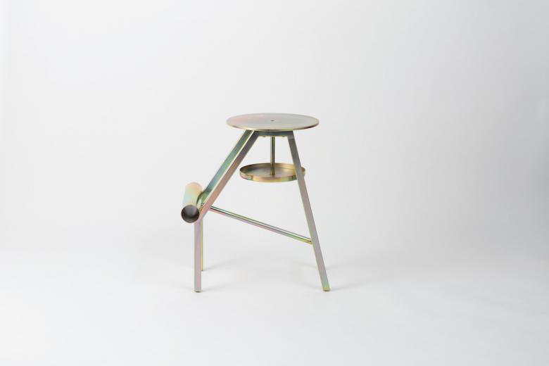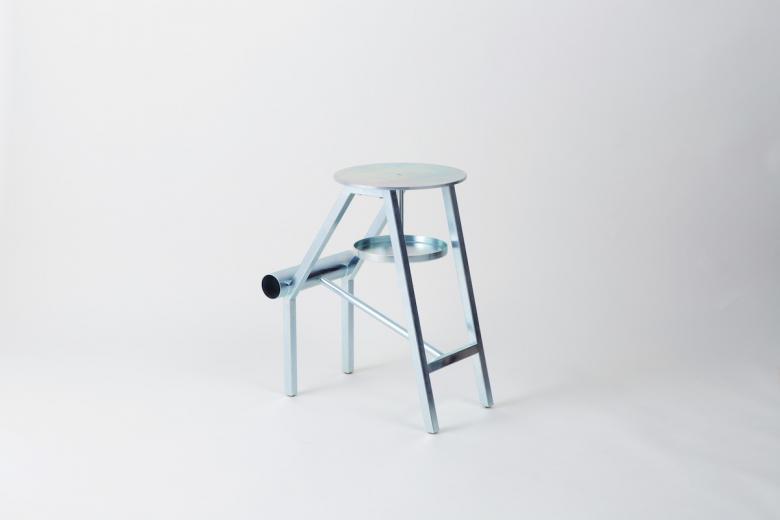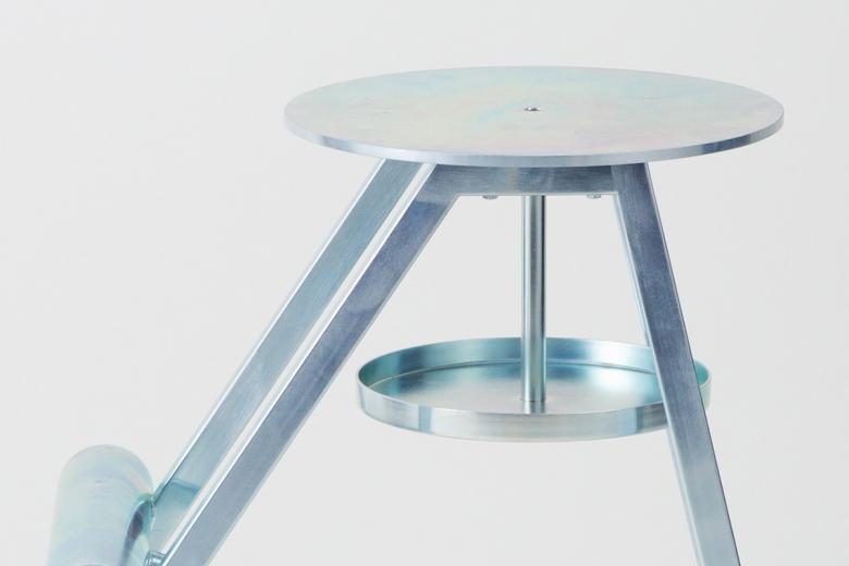 This compact, yet useful stool was created especially the putting on, taking off and light care of shoes. Not only does it provide a seat for taking off and putting on shoes, but it also serves as a platform for tying and polishing shoes as they are worn, and is fitted with storage for care-related goods such as brushes, cloth, creams and spray. Keeping a roughness of use in mind, this stool is finished in a unichrome/chromate plating, the likes of which is also used in the production of tools. It is a design that is at once furniture and heavy duty implement.