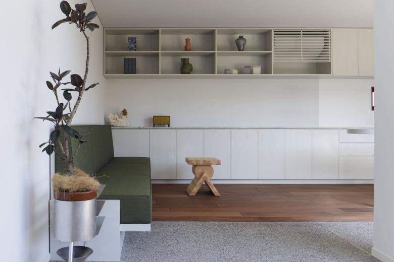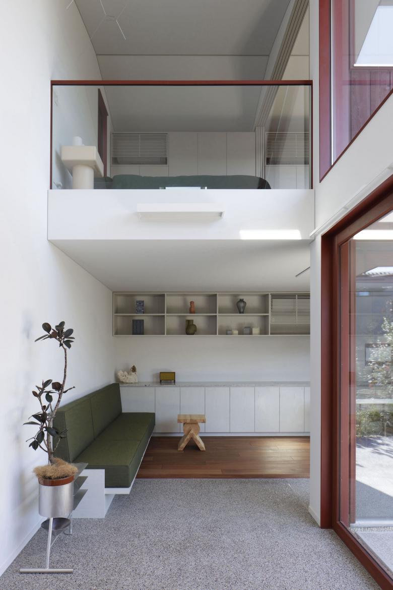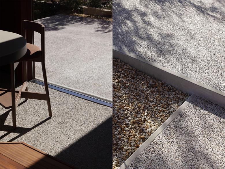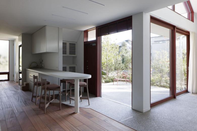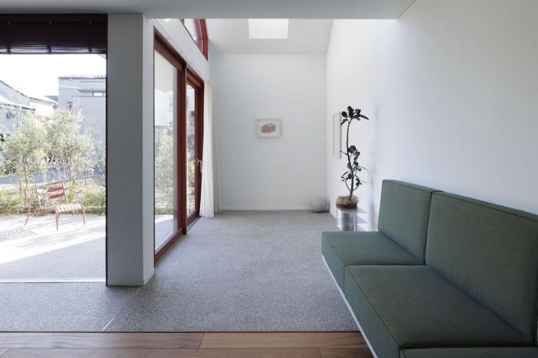 With the greenery at its side, the approach integrates with the terrace and leads continuously to a large earth floor with an atrium. The area from the entrance to the earth floor is finished with a reddish stone mixed with washed out stone. This floor connects both the inside and the outside of the house, blurring the boundaries in a variety of situations.