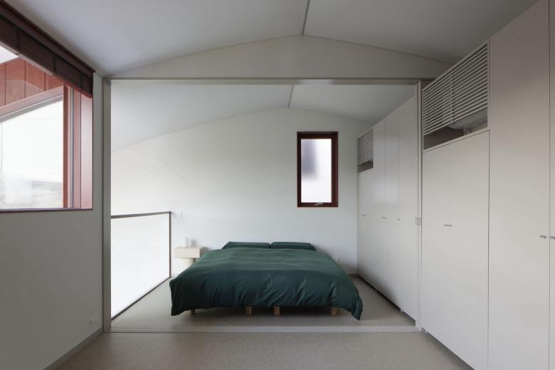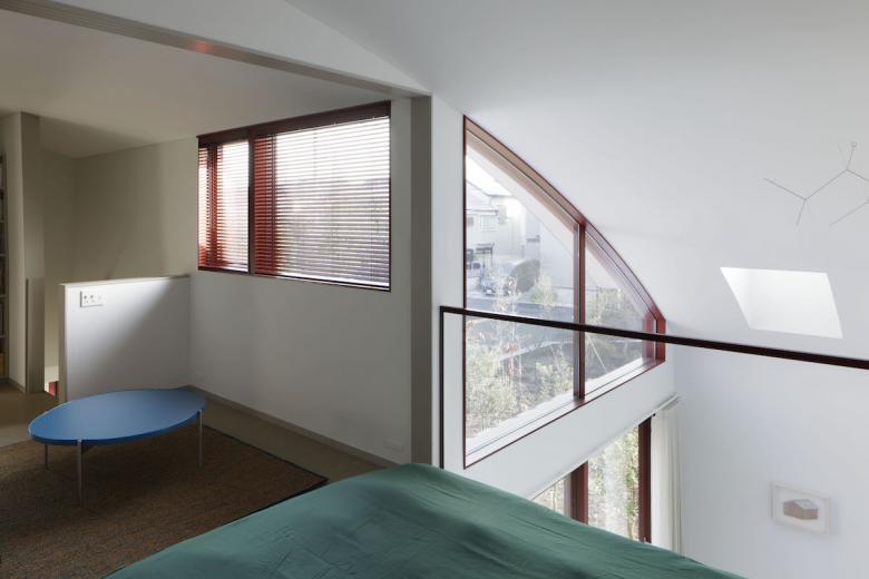 The ceiling of the earthen floor, which is a vaulted ceiling, is the place where the broad arc expression of the ”mukuri roof” is most apparent. The residents’ private bedrooms on the second floor are again connected to this atrium, allowing their vision and also the ventilation to circulate throughout the house. While the chairs on the first floor were designed to match the counter, a low table was originally created for the second floor, where a sense of calm was demanded. This contrasts with the first floor by emphasizing the nature of floor seating.