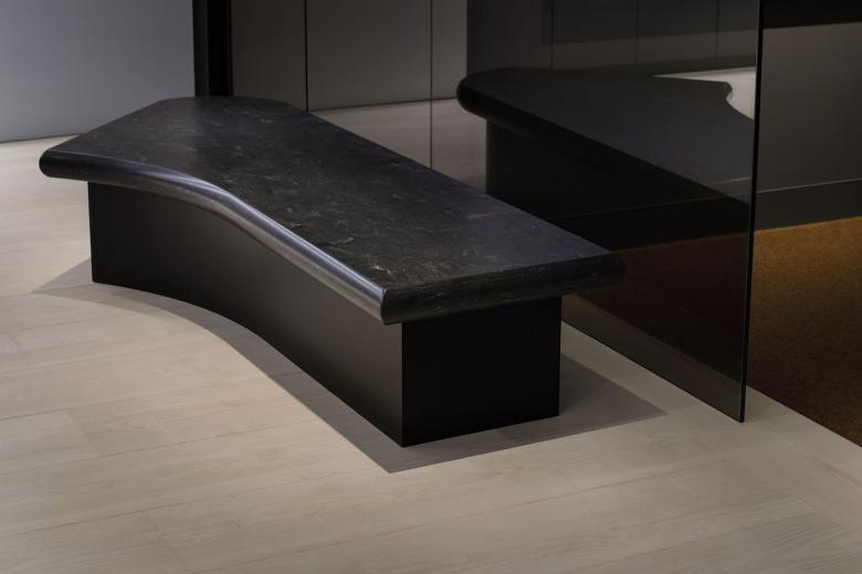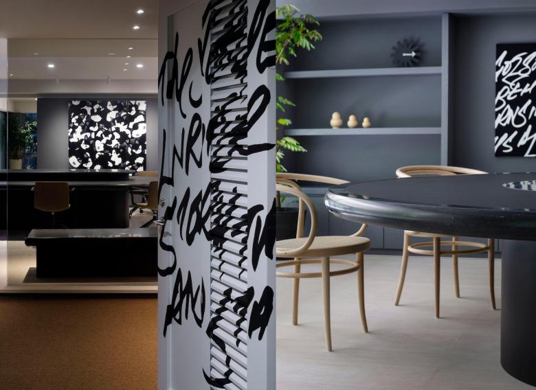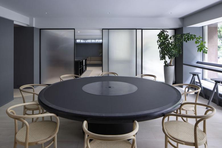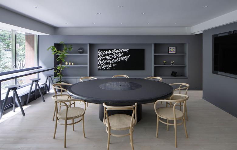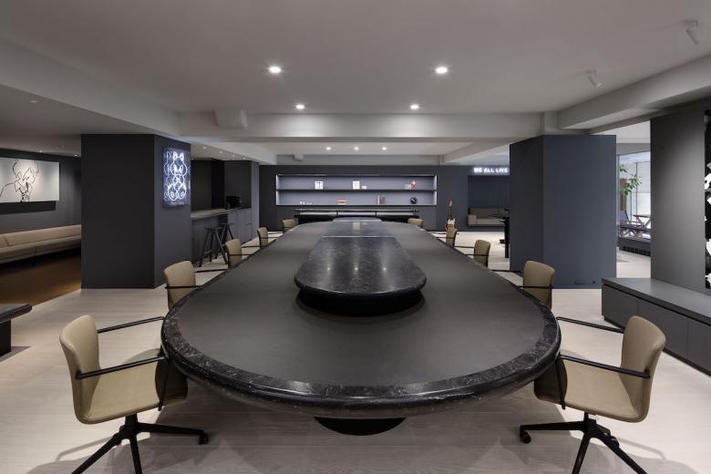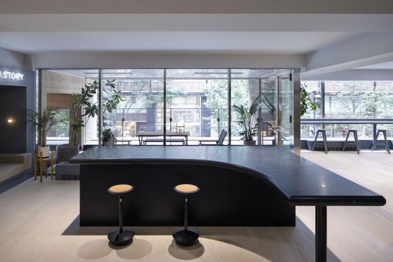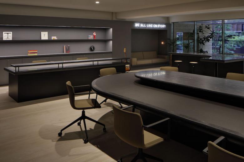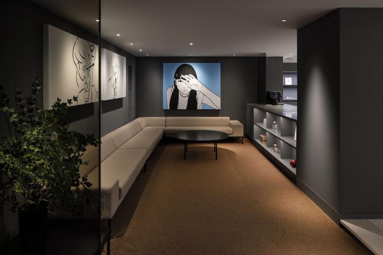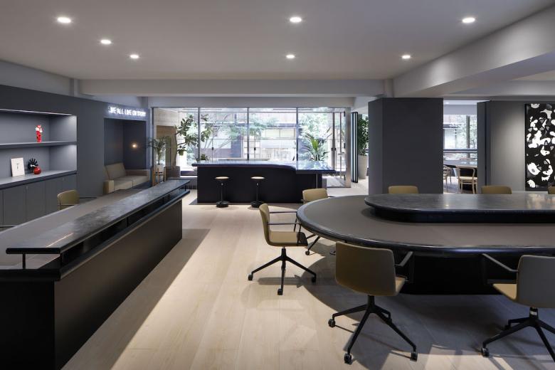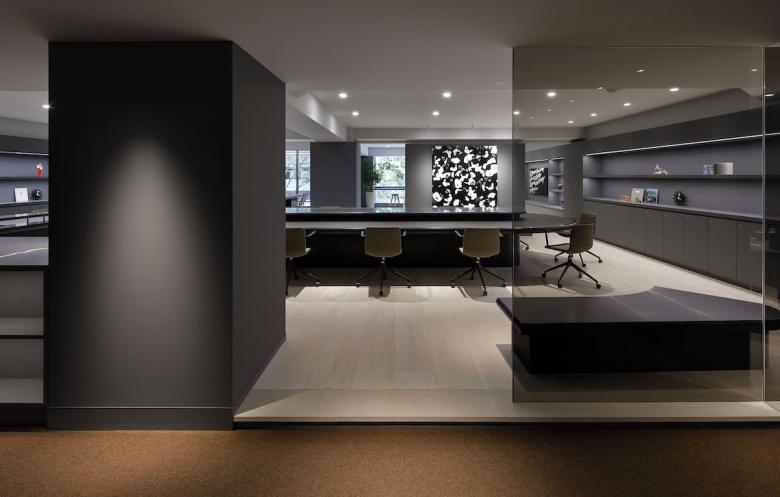 Essentially, the office is designed to be used on a free-address basis, with each person being free to use the space as he or she sees fit. The form of the furniture placed in each space were naturally derived from its function, while plotted in a landscape approach, much like objects scattered throughout a park. Black artificial marble was used for all table tops, creating a sense of unity even though each has a different shape. Douglas wood for the flooring material, wicker mesh furniture and sofa upholstery were used, adding a sand beige color to the palette, combined with the gray walls to keep the overall balance in color tone. At the client’s request, library storage for their inspirational art books and walls for displaying artwork were planned in various areas. The office is like a park or a plaza, but also like a gallery. We sought an office space with a sense of freedom and stability suitable for their creative activities.