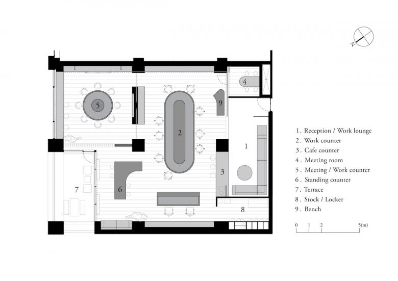 The existing space has an opening for natural light and a terrace on the north side, and is a general office space with a pillar pattern at a fixed pitch. We first plotted necessary spaces for each zone, taking this pillar pattern into consideration. More specifically, we laid out a sofa space that can be used as a reception area and a work lounge at the entrance, a main workspace, a café counter, a small private room for meetings, a multi-purpose workspace that can be used for meetings by using partitions, and a standing counter right next to the terrace.