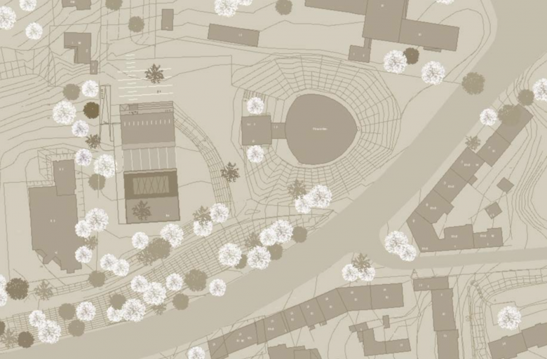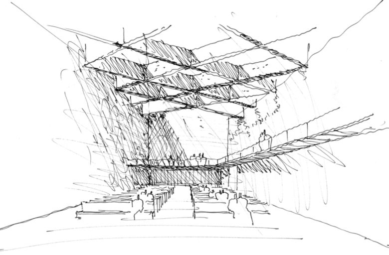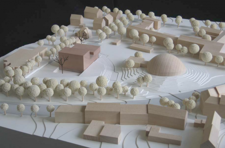 Das neue jüdische Zentrum mit Synagoge entsteht als Solitärbaukörper auf der vorhandenen Wiesenkuppe in Anlehnung an die Kulturgeschichte „des Tempels auf dem Berge Sinai“. Es symbolisiert „ein Haus“ des Austausches und der Begegnung; ein Podium für Toleranz und Dialog. Die skulpturale Ausformulierung entsteht aus dem Inneren heraus und macht die einzelnen Funktionen ablesbar - die Form erinnert an eine ausgerollte Thorarolle. Das gefaltete hölzerne Tragwerk des Daches im Kirchenraum symbolisiert den Davidstern und inszeniert den Raum auf besondere mythische Weise.