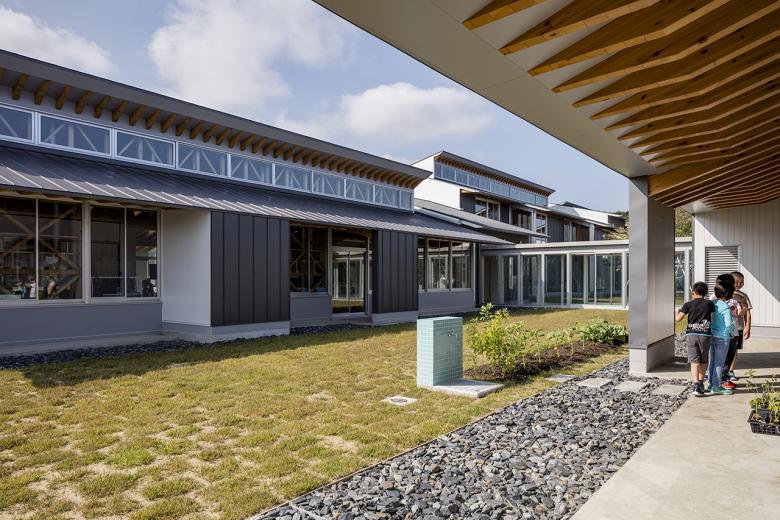 In the surrounding environment surrounded by the lush greenery and residential area of the distant view mountain, we planned the townlike elementary school by nestling around the houses. It is divided into subdivisions with zones, and consists of open ordinary classrooms per grade and flexible open spaces utilizing spare classrooms.