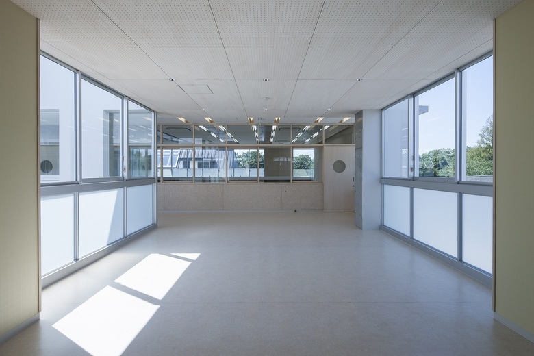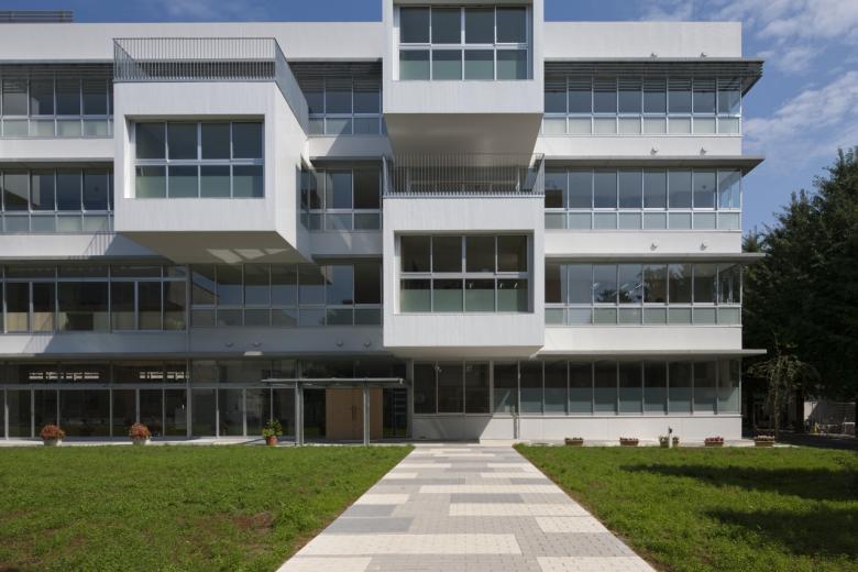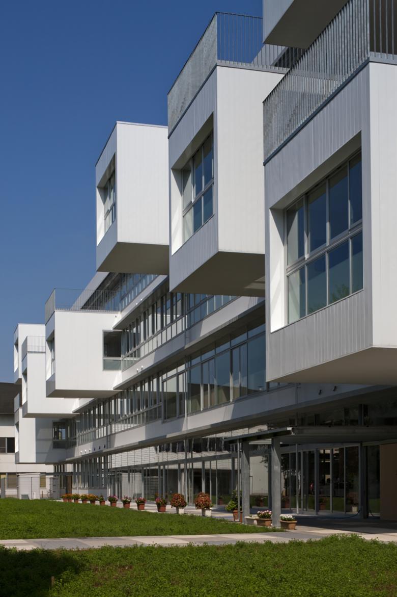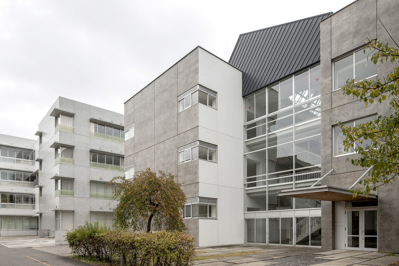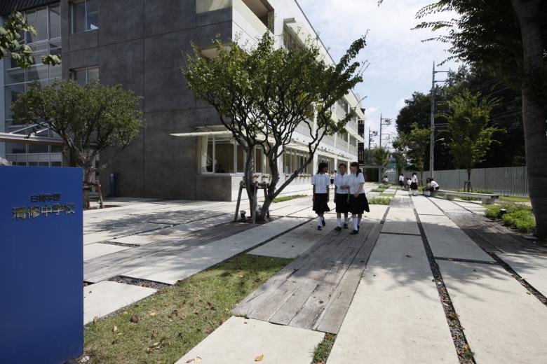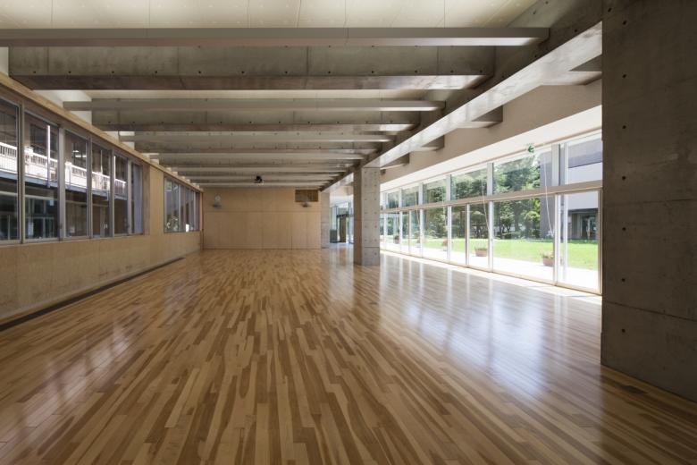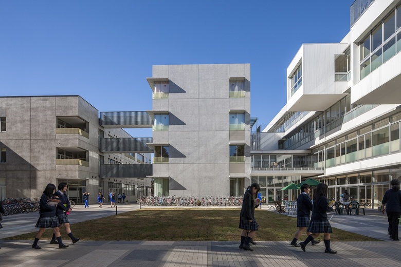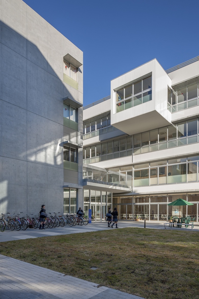 A redesign of a combined junior-senior high school located within a larger educational campus. Shiraume Gakuen Seishu Junior High School is the first stage of a plan to gradually reconstruct a number of linear school buildings making use of the void spaces interspersed between them. The school building was designed to symbolize a new educational philosophy called the “learning atrium,” in which students and teachers are able to interact freely in a series of classrooms arranged under a single roof around a large, multi-story open space. The whole structure is naturally warmed by sunlight and ventilated with windows in the top part of the building.