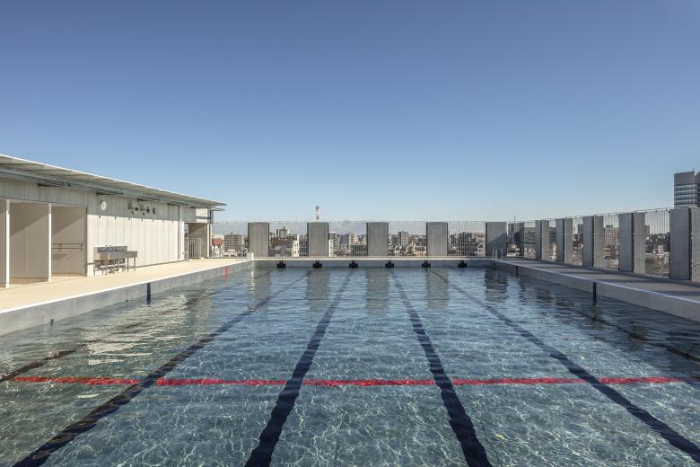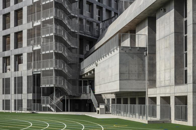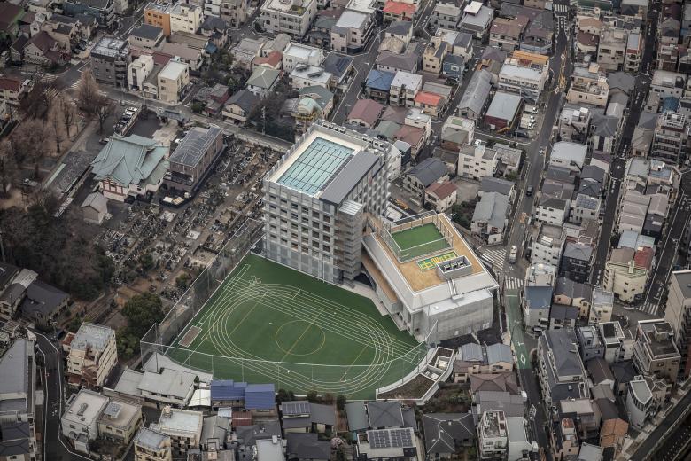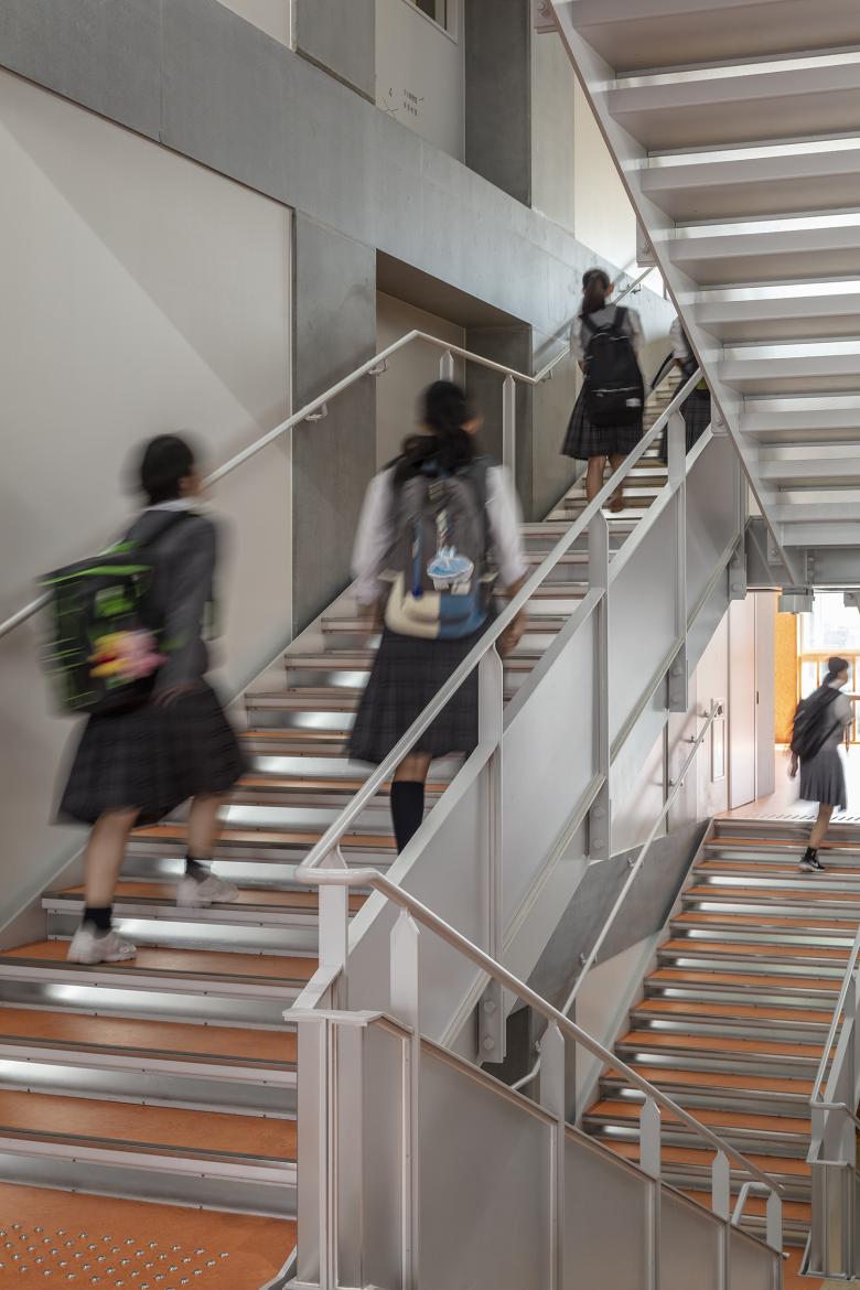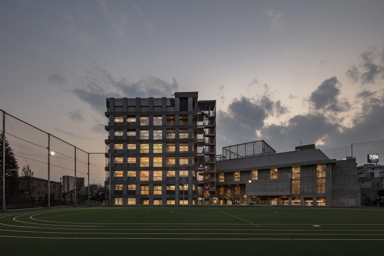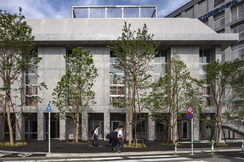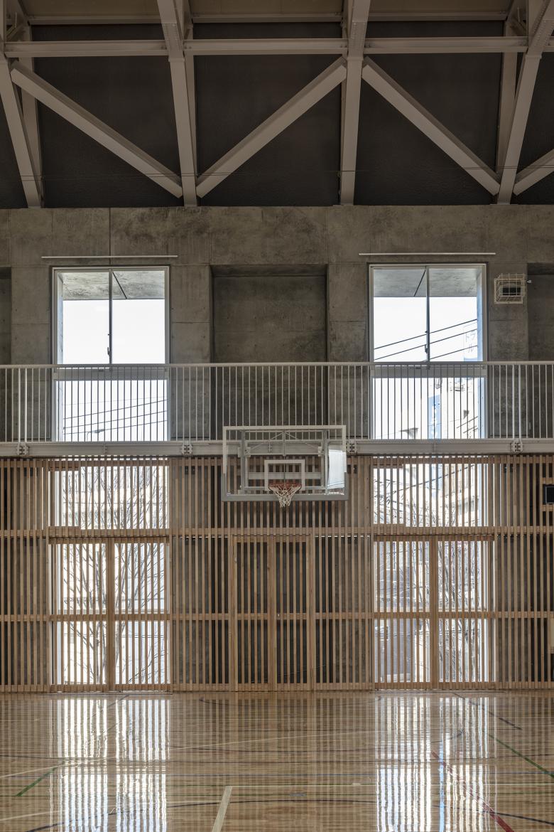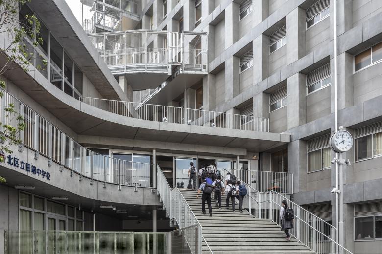 This junior high school is planned on the former Takinogawa Seventh Elementary School site, as part of Kita Ward's appropriate school placement plan. The site is located in an area that still retains the atmosphere of what was called literary village “Tabata Bunshimura”, the name of the area where many writers and artist gathered, in the early 1900s. On the north side, there is a large retaining wall that arises from the topography, and together with the adjacent temples and shrines, a valuable open space in this area is formed. This school is required to have a gymnasium, a swimming pool, regular classrooms (12 classes), disaster prevention base functions, etc. on a narrow, deformed site of about 7,200 ㎡ in residential areas. The deformed artificial turf field is integrated with open spaces such as adjacent Dairyu-ji temple and Hachiman shrine, leading to the preservation of the local atmosphere and memories. The school site adjacent to the road is released, and the corner facing the intersection in particular is intend to the remnants of that time as a forest on the street corner. The gymnasium building facing there has a regional opening on the 1st floor and an arena on the 2nd floor, which can be used independently. Students come to school from the stairs on the 2nd floor, the 3rd to 5th floors are composed of one floor for each grade, and the 6th and 7th floors are for special classrooms. Students move mainly by stairs, and in order to strengthen the continuity and connection between the upper and lower floors, and X-shaped gentle staircase with the two entrances and exits is installed in the center of the building to connect the open space. The staircase is intended not only for movement, but also as a space where students can stop and talk and become an opportunity for encounters and exchanges. The 5th floor can be used the athletic field on the gymnasium building roof. The high-rise school building requires high durability and construction accuracy, and the reason of reducing construction noise for the surrounding area, the structure is made of precast and prestressed concrete. This project is a high precision, a high-quality frame itself become the exterior, and the school get to the symbol of new community as well as the inheritance of the local scenery.