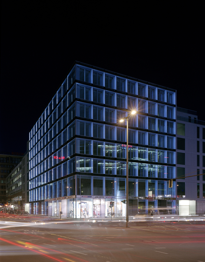 A glass cube, light, transparent and shining, yet at the same time having a surprising materiality and minimalist power, defines this prominent city block corner near the Kurfürstendamm. It is made up of the newly developed „cell facade“, a further development of the double skin facade in technical, building physics and architectural terms. This is part of the buildings overall ecological concept. It saves energy and improves thermal comfort in winter, and there is soundproofing with natural window ventilation at this busy traffic junction