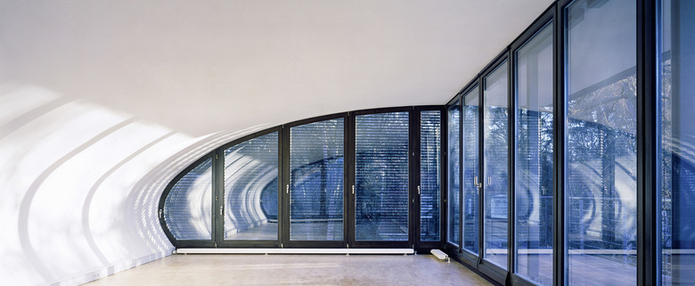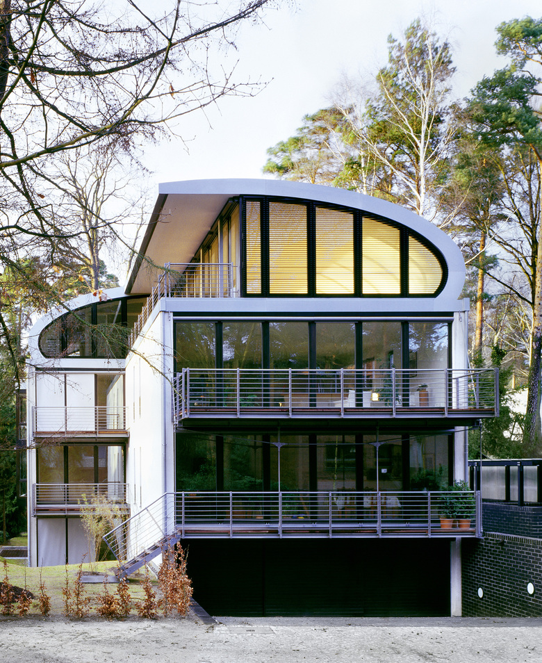 This project represents a so-called "Urban Villa", a very popular building type in Berlin during the 1990’s, otherwise often realized in a half-harted "retro-style". Comprising 5 freehold apartments, this building in a densely wooded location was conceived with a consistent modern design approach and an emblematic contemporary architecture. The evocative roof shape is formed from monocoque-shell elements and creates maximum living room volumes within the space allowed by planning regulations. The built volume is staggered in depth and fits in with the surrounding single family houses. Each of the five apartments has windows on all sides. Floor plans can be flexibly altered for the long term through the use of design features such as wide-span ceilings and non-load-bearing inner walls.