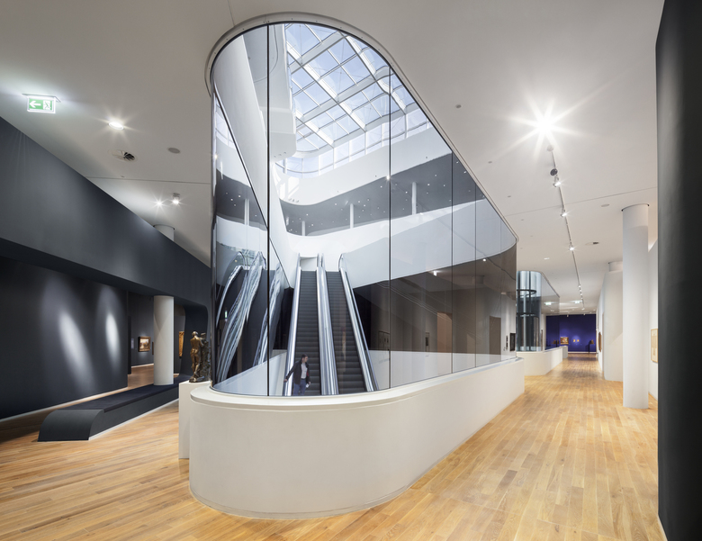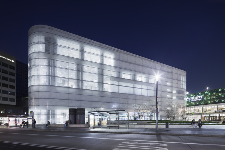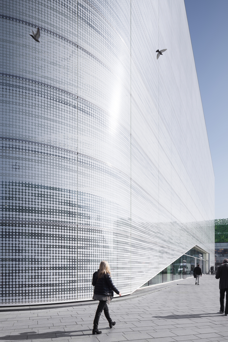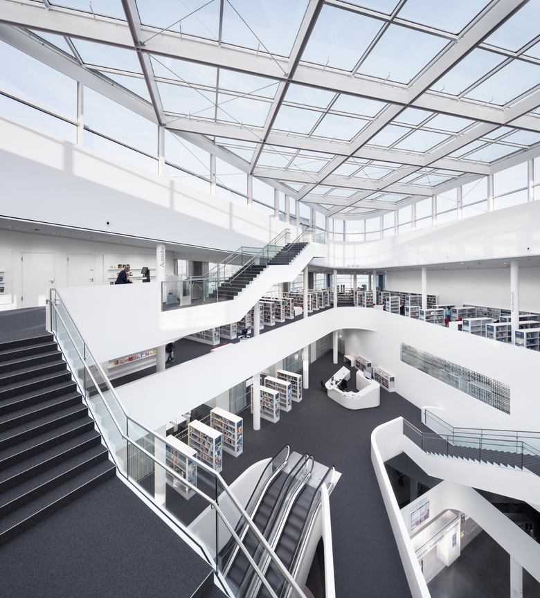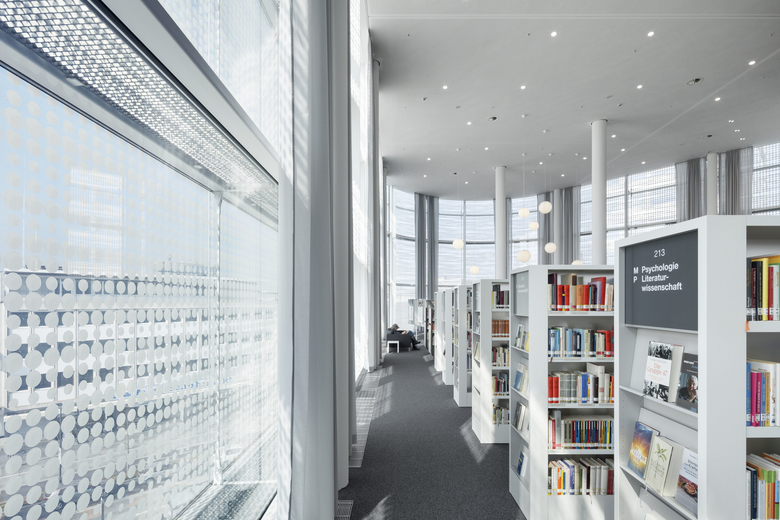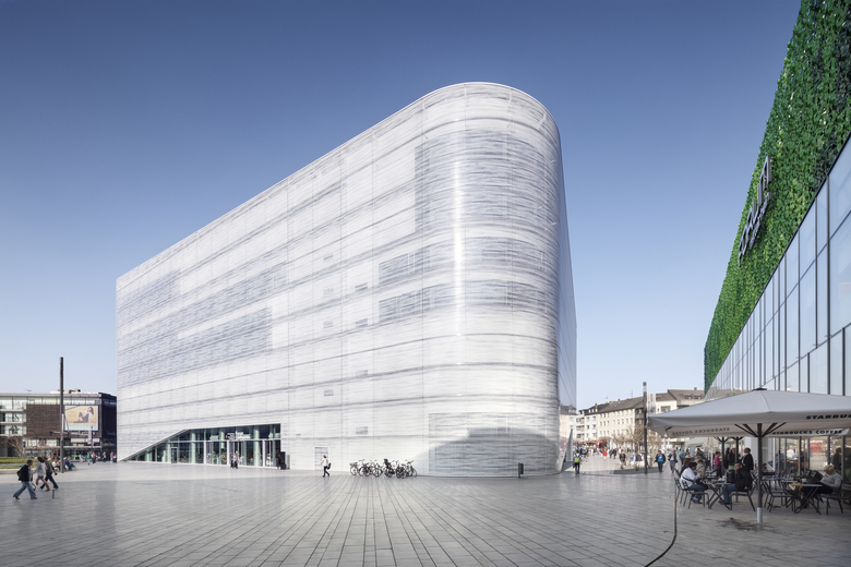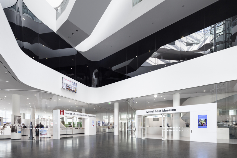 The Kulturbau Koblenz ‘Forum Confluentes’ and the shopping mall ´Forum Mittelrhein´ together form the design for the redevelopment of the central square of Koblenz. This square, the Zentralplatz (Central Square), not only connects the various districts of Koblenz with each other but also has an important function as a public transport interchange and place where various pedestrian flows come together. The Kulturbau houses the Mittelrhein-Museum, the public library/ media center and the Tourist Office of Koblenz. A huge public accessible roof terrace becomes a new public space and allows 360° views over the Unesco Heritage site of the ´oberes Mittelrheintal´. The combination of these different cultural institutions offers the chance to exploit the synergies between the various institutions. The cultural building stands solitary in the new central square and is a landmark due to this solitary character, its facade design and the conscious elevation in the city. The building has splendid accessibility for visitors; the central lobby has entrances from all sides and is therefore a natural part of the urban fabric. The volume has a double facade with a Structural-Glazing construction of white silk-screened glass, which envelops the building like a second skin and offers a frosted and refined appearance. The motif of the print provides a filtered view from inside to outside, and allows a vaguely transparent view when looking from the outside in. At the different entrances, the outer facade has a spacious cut and therefore offers a direct view of the lobby and entrance areas.