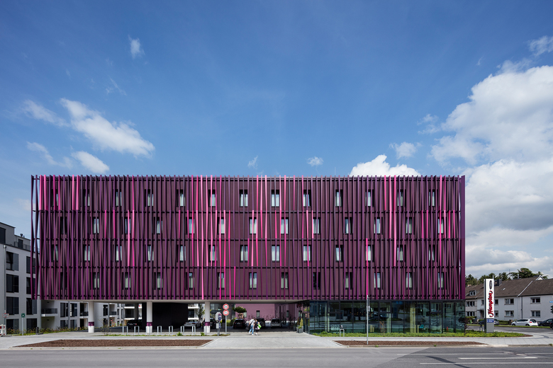 The hotel´s outstanding and memorable constitutive criteria is the custom made curtain wall made of three-dimensionally shaped aluminum sheets. They are vertically arranged – breaking through the punched window façade´s stringent rhythm and creating a subtle dynamic through their varying dimensions. With its spatial deepness and powerful crimson colour, the hotel´s façade sets a distinctive creative mark with a striking long range effect at one of the city´s most important radial roads.