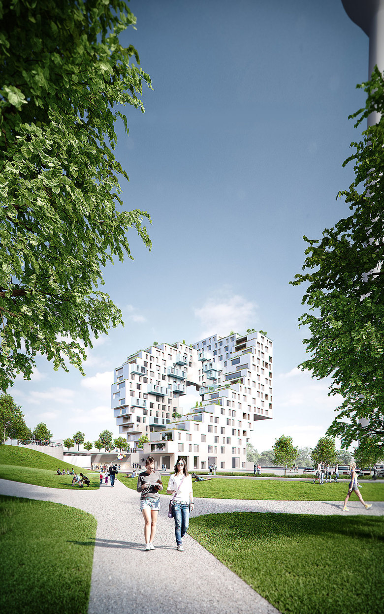 For our claim to connect the location more strongly to the city, we offer urban density and a maximum of public space. Our design is derived from the surrounding city area. The existing park is extended by the base of our U-shaped building staggering down towards the park and the city, the vast cut-outs offering framed views between the open space and the river area.
