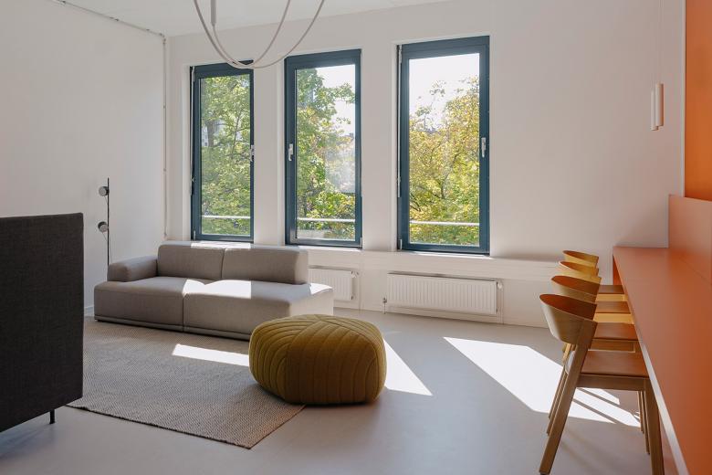 Im dritten Obergeschoss wurde die kleinteilige Struktur zurückgeführt, sodass eine großzügige loftartige Bürofläche entstanden ist, die flexibel an individuelle Bedürfnisse angepasst werden kann. Sichtbare Bestandsdecken verleihen den Räumen einen modernen Industrial-Charakter.