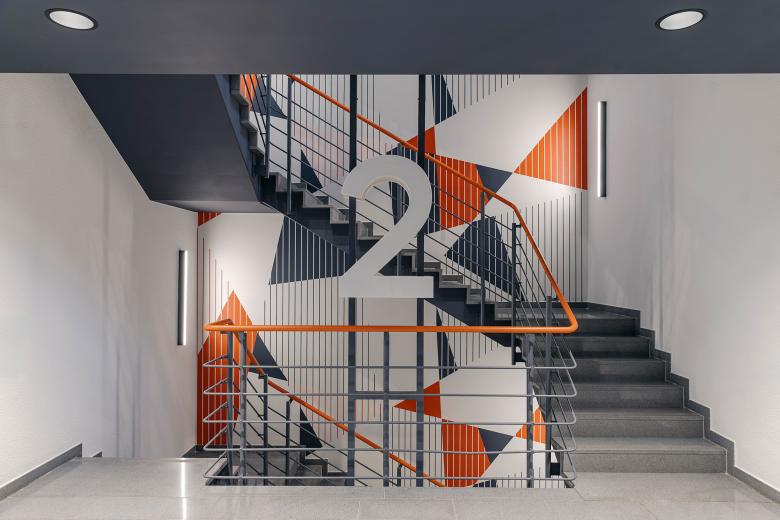 Schon beim Ankommen setzen modernisierte Eingänge, klare Signaletik und aufgewertete Fassaden neue Akzente. Begrünte Außenanlagen und Dachterrassen laden zum Verweilen ein, Sitz- und Kommunikationszonen fördern Austausch und gemeinsames Arbeiten. Innen entsteht durch frische Farb- und Lichtkonzepte, Motivwände und eine markante Lichtinstallation eine neue Atmosphäre. Mit der Marketinglounge im zweiten Obergeschoss – ausgestattet mit Loungebereichen, Meetingraum und Teeküche – entstehen Räume, die Offenheit und Kommunikation fördern.
