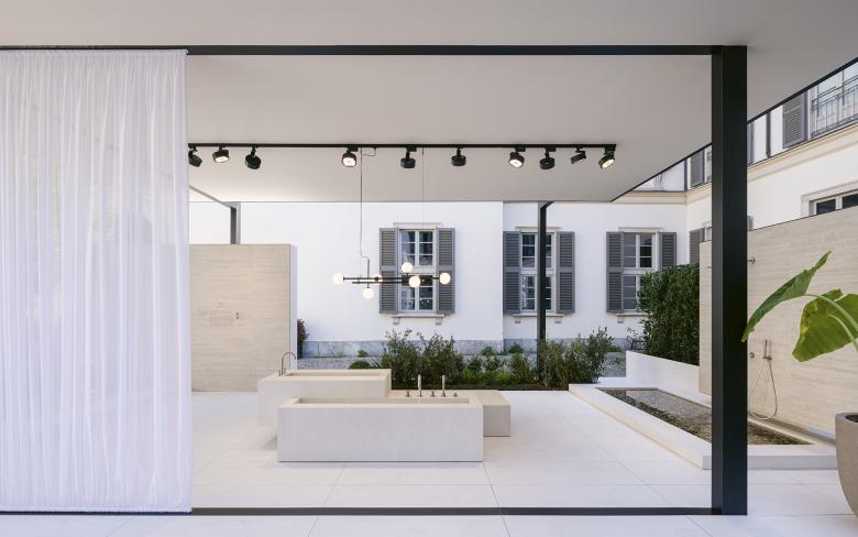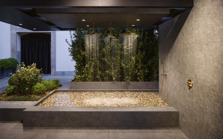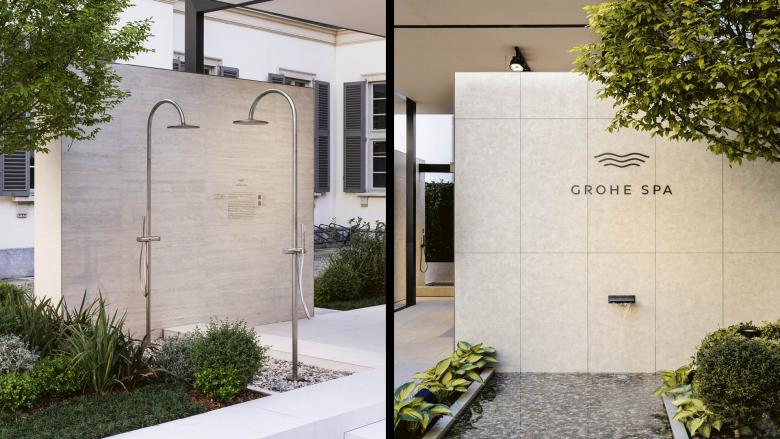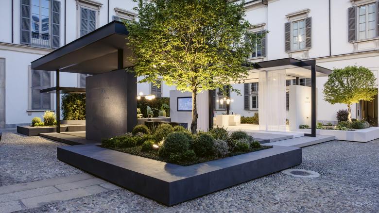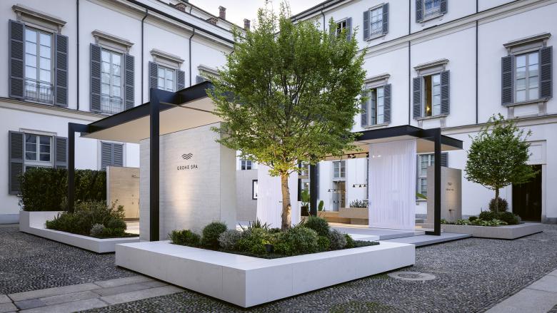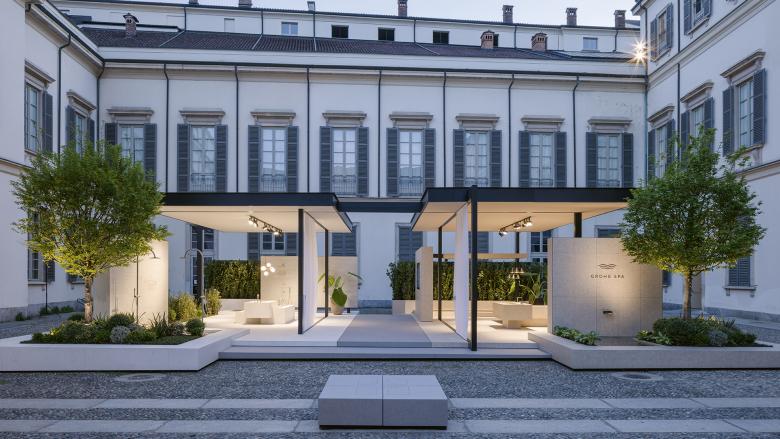 Every year, the international design community gathers in Milan for the furniture fair and Design Week. GROHE presents its premium sub-brand GROHE SPA in an immersive installation at the Palazzo Reale in the city center. The concept was developed in collaboration with the Design and Brand Identity team of LIXIL Global Design. The idea of "Aquatecture" merges water and architecture, transforming the Cortile d’Onore, the former courtyard garden of the Palazzo, into an oasis-like inner courtyard.