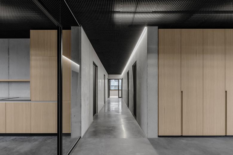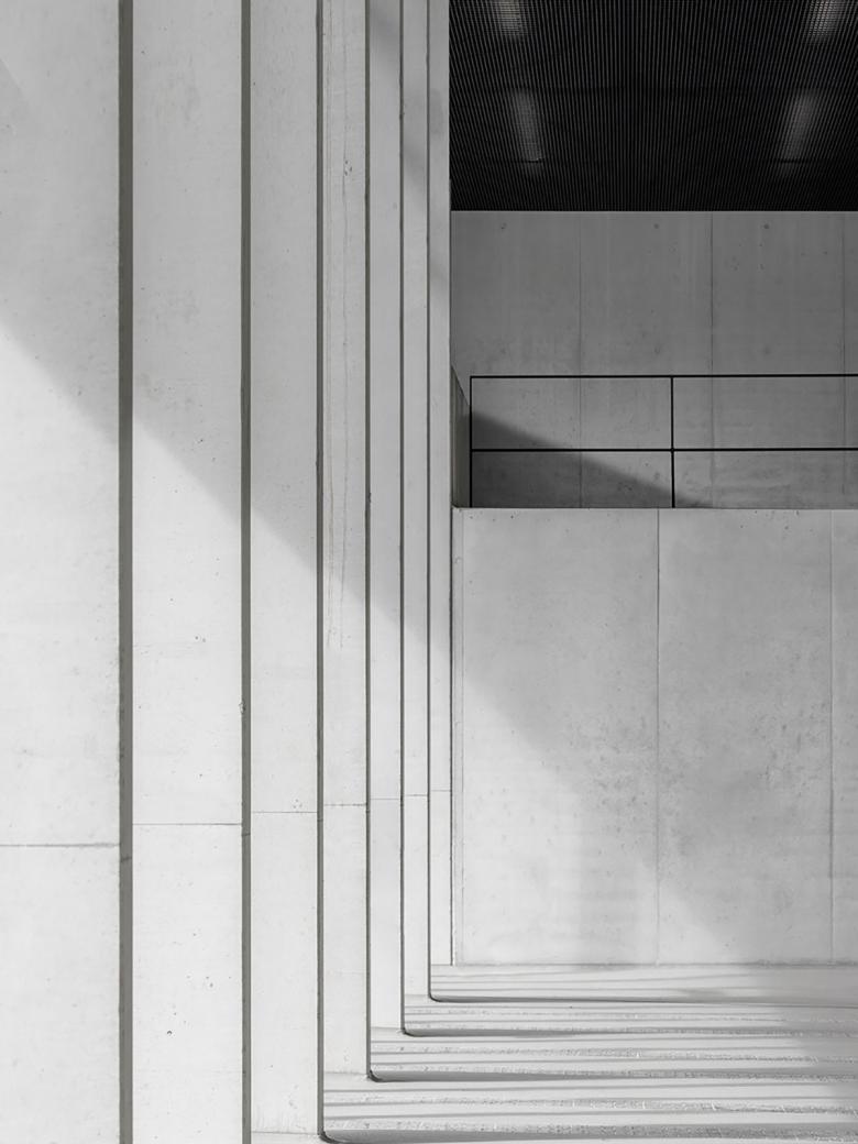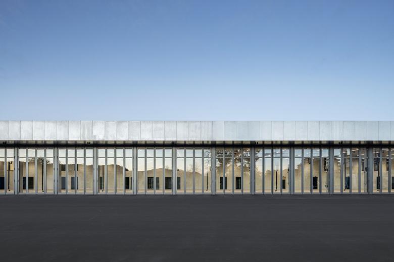 Die funktionale Nutzung des Gebäudes drückt sich in seiner Materialität aus: die Metallbekleidung der geschlossenen Außenwandflächen zeigt ein spannungsreiches Wechselspiel mit den großflächigen Verglasungen der Fahrzeughallen Tore und Fensterbänder.