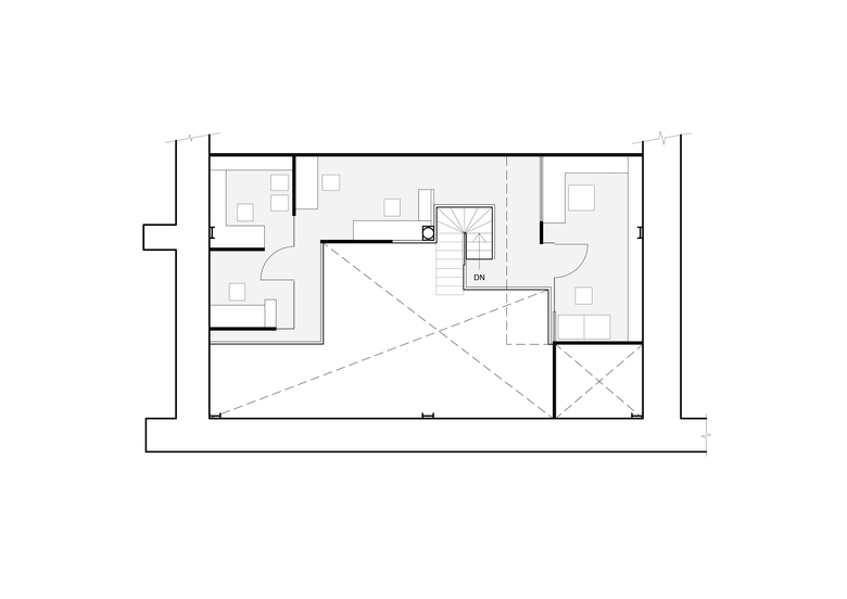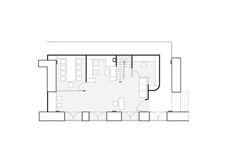 The new functions are accommodated in a mezzanine floor inserted along one edge of the space to maintain the original grandness of the space. The old shell has been restored through careful cleaning to reveal the original Minton tile flooring and the natural grain of the wooden shutters.